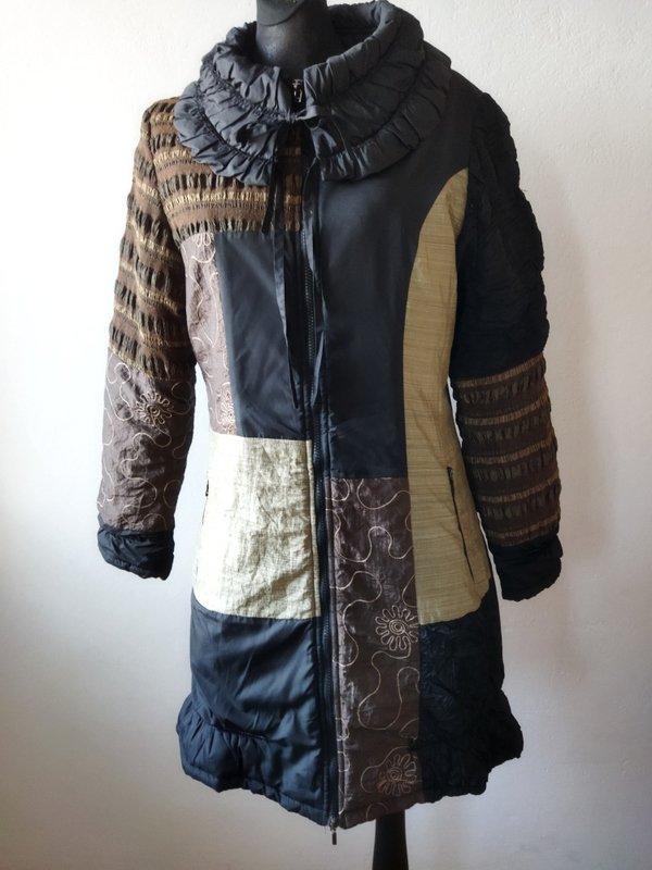 Unikatowy patchworkowy płaszcz vintage z poliestrowych faktur o różnych fakturach i wzorach w kolorach czerni, oliwkowej zieleni, odcieni brązów i beżu, częściowo haftowanych. Z uroczym drapowanym kołnierzem , z dwiema wpuszczanymi kieszeniami z zamkami. Zapinany na zamek . Na ocieplanej pikowanej podszewce.