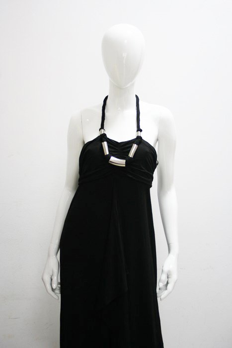 Czarna sukienka dluga. Z przodu zdobiona falbanką. Ramiączka zdobiona posrebrzanymi pierścieniami.