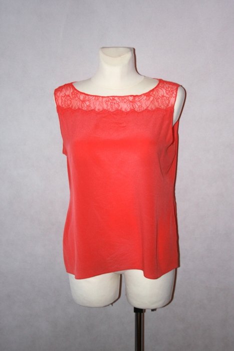 luźna łososiowa bluzeczka renomowanej angielskiej marki, z koronkowym wykończeniem pod szyją i na ramionach, materiał delikatny, z lekkim połyskiem, wg mnie jedwab (brak metki ze składem)
