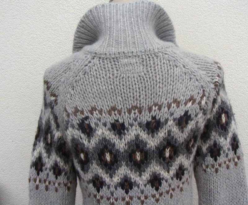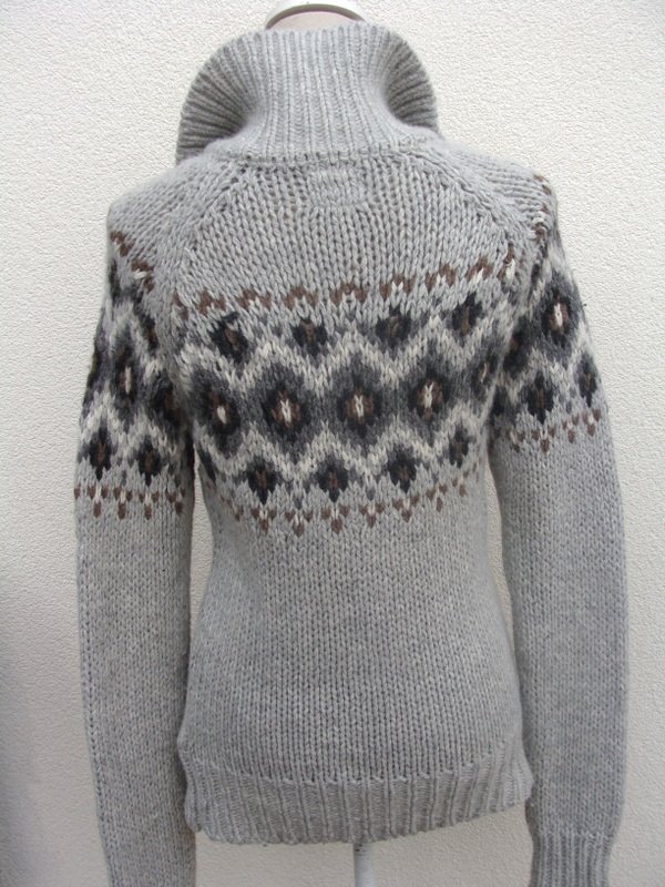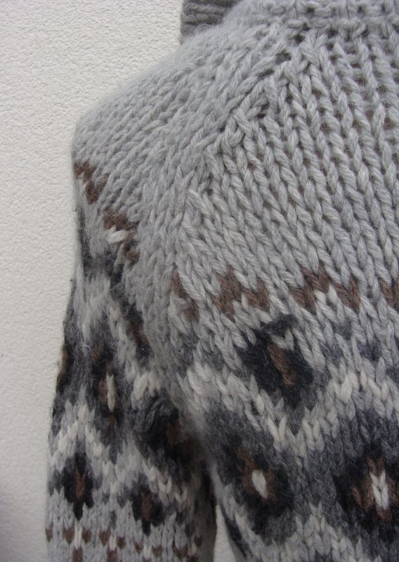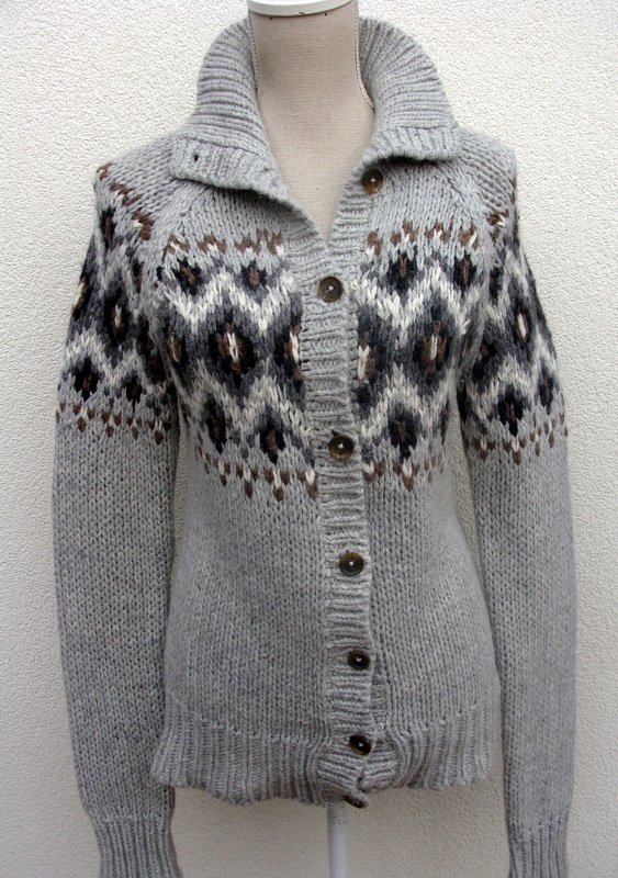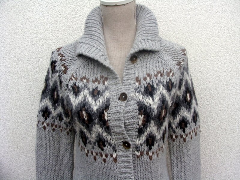 Wzorzysty sweter z mięsistej włóczki w jasno szarym kolorze z dodatkiem brązu , bieli i ciemnej szarości we wzorach. zapinany na całej długości na guziki, rękawy raglanowe. Wykończony ściągaczami.