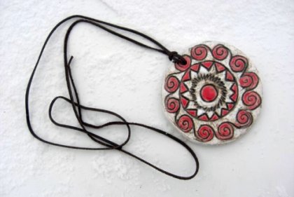 Ręcznie formowany i zdobiony wisior ceramiczny ze szlachetnej kremowej gliny. Obustronny. Na naturalnym tle gliny czerwienie, brązy i ciekawy, marmurowy motyw w tle. Wzór ryty, pogodny, mandaliczny. Na rzemieniu jubilerskim. Średnica 7. Długość z rzemykiem max. 40 cm. Autorski.