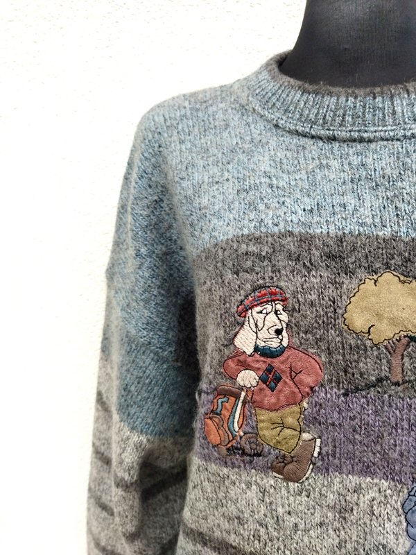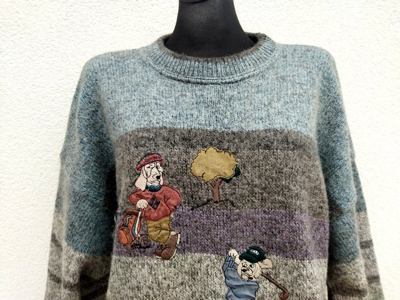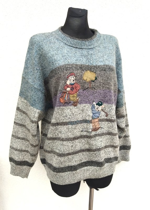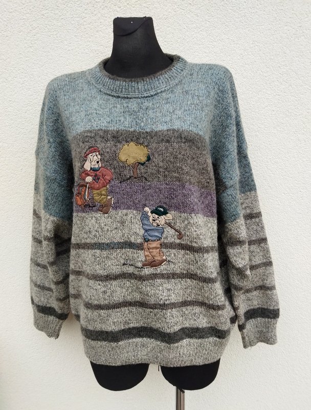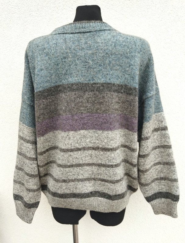 Wełniano-akrylowy sweter w melanżowej stonowanej kolorystyce odcieni szarości, brunatnego brązu i zgaszonego błękitu z naszywanymi aplikacjami . Wykończony ściągaczami