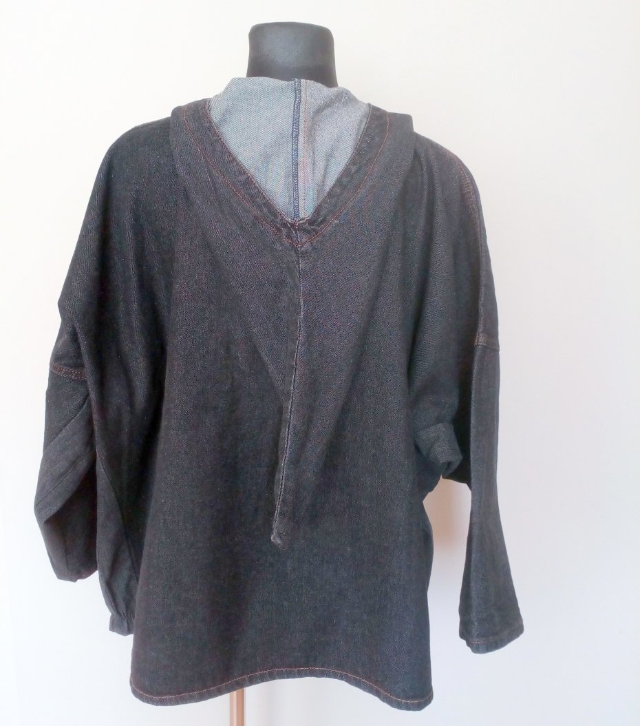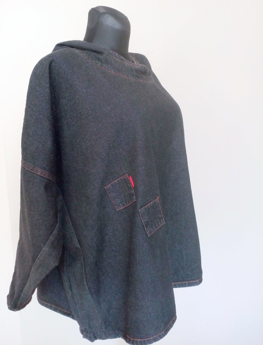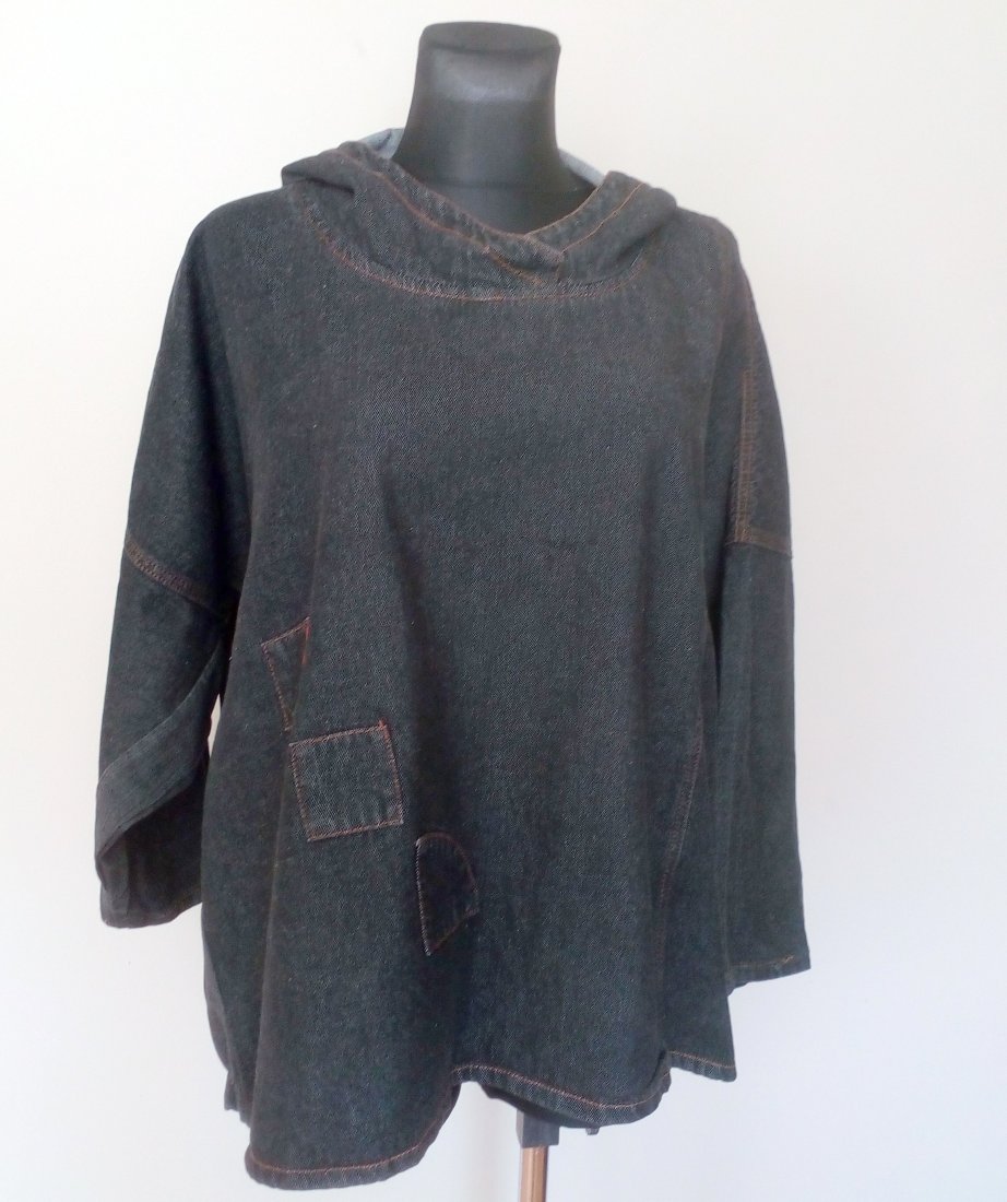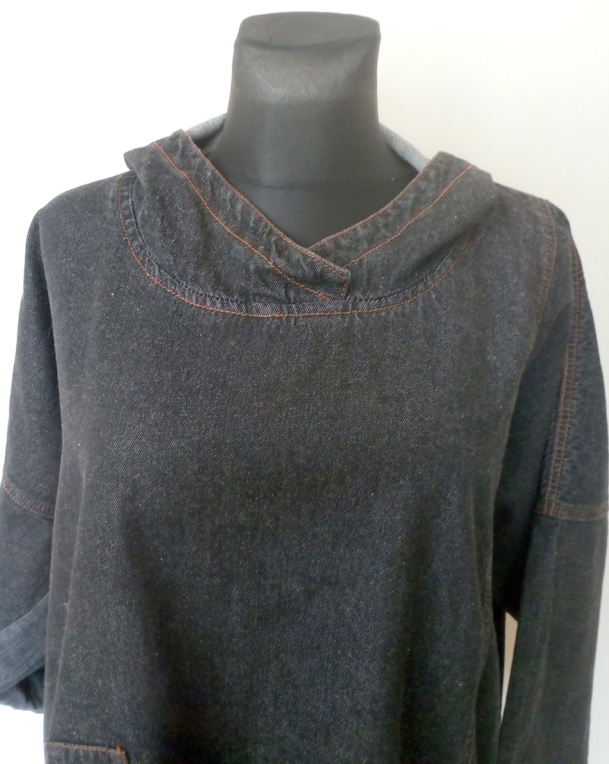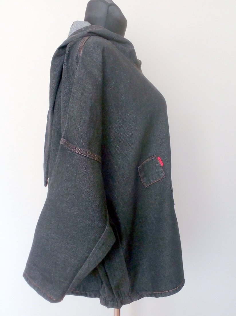 Jeansowa kurtka z elfim kapturem, zakładana przez głowę, rękawy obniżane, fason oversizowy, kolor ciemny grafit