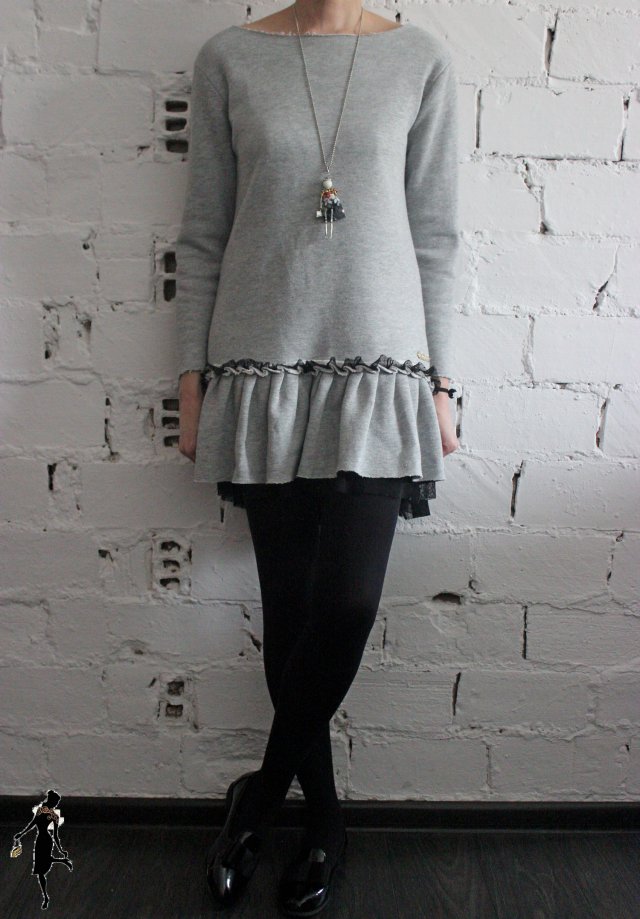 Sukienka z falbanką. Firma La mimmo. Rozmiar z metki 40/L. Wymiary: obwód biustu-48cmx2 (mierzony od pachy do pachy), obwód bioder-50cmx2, długość rękawa-54cm, długość przodu sukienki-82cm, długość tyłu sukienki-88cm. Skład materiału: 70% bawełna, 30% elastan. Sukienka nosi ślady użytkowania w postaci delikatnego zmechacenia na bokach sukienki.
