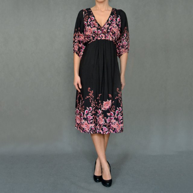 Sukienka francuskiej marki LA REDOUTE. Czarna, ozdobiona kwiatowym wzorem. Z boku zapinana na zamek. Na podszewce. Materiał z leciutkim połyskiem.