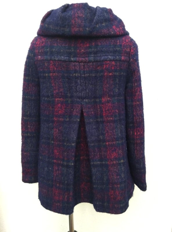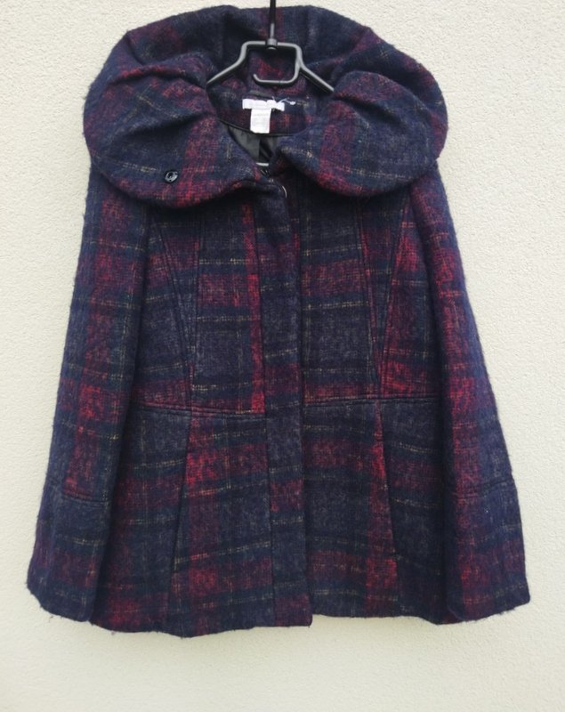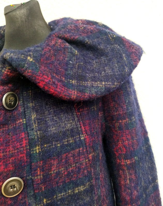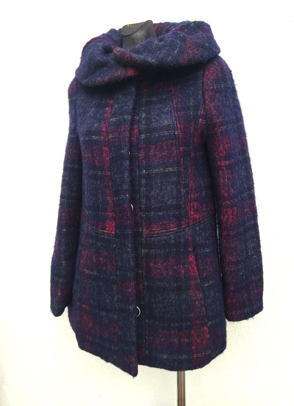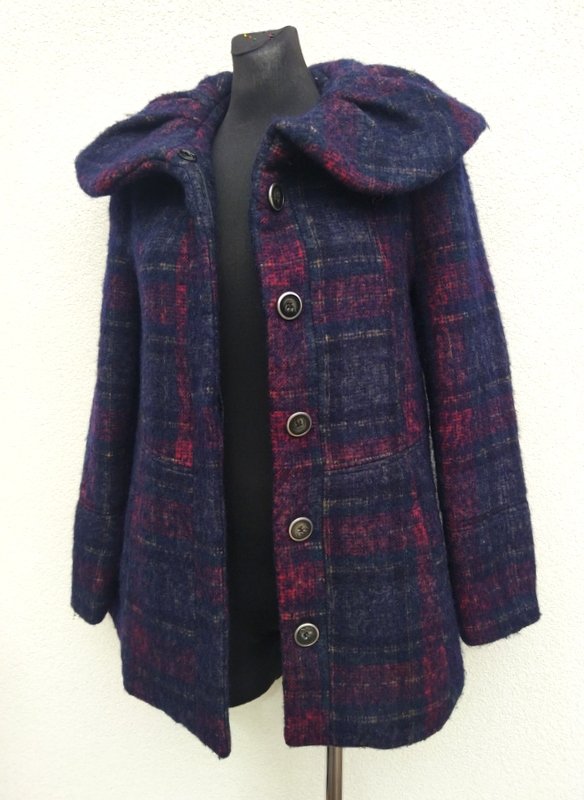 Ciepła kurtka z moherową faktura z poliestrowo-wełnianej tkaniny w kratkę w kolorach granatu, buraczkowej czerwieni i oliwki. Z wykładanym fantazyjnym kołnierzem , z dwiema wpuszczanymi kieszeniami. fason trapezowy z kontrafałdą z tyłu zaszywaną do połowy pleców. Zapinana na guziki - zapięcie kryte. Całość na podszewce.