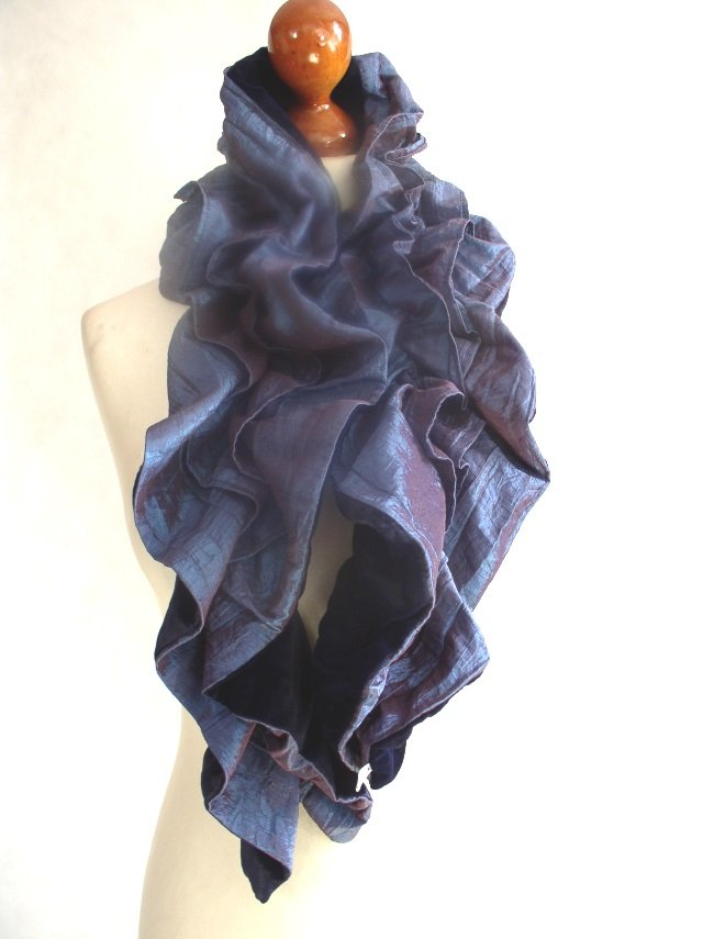 Szalik firmy La Sltane,dwuwarstwowy.Spód granatowy aksamit,wierzch z materiału lekko szeleszczącego w odcieniach fioletu i niebieskiego.Na wierzch naszyty materiał,przez naszycie gumki,całość marszczy się.Stan bardzo dobry.Długość bez rozciągania 110 cm.szerokość 20 cm.