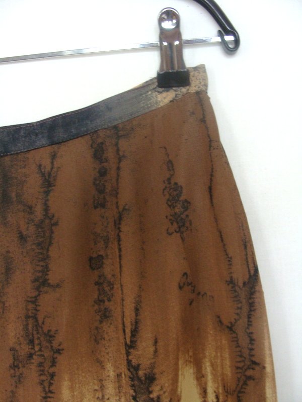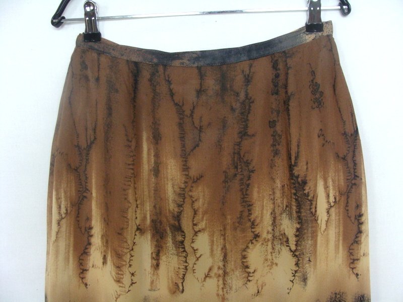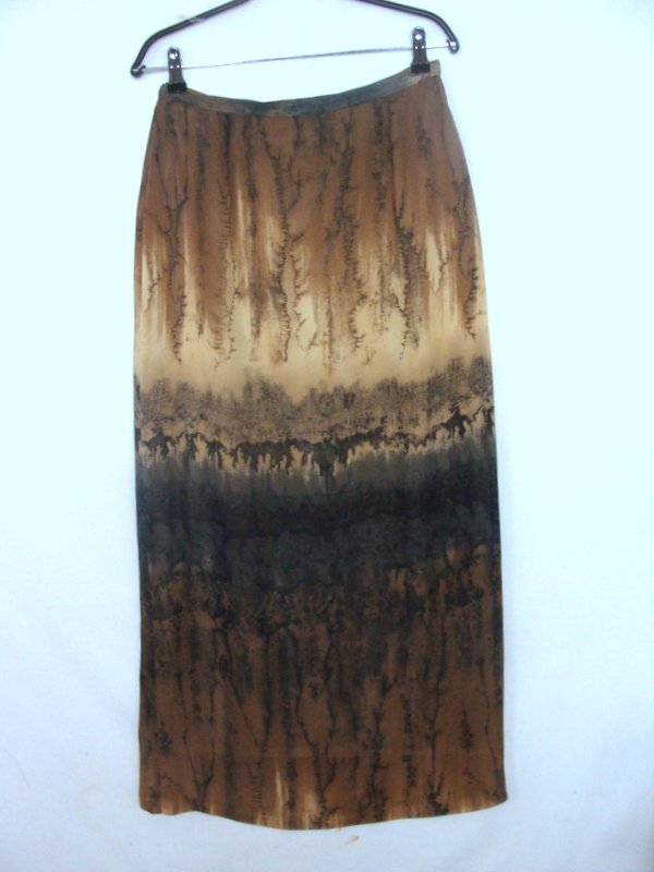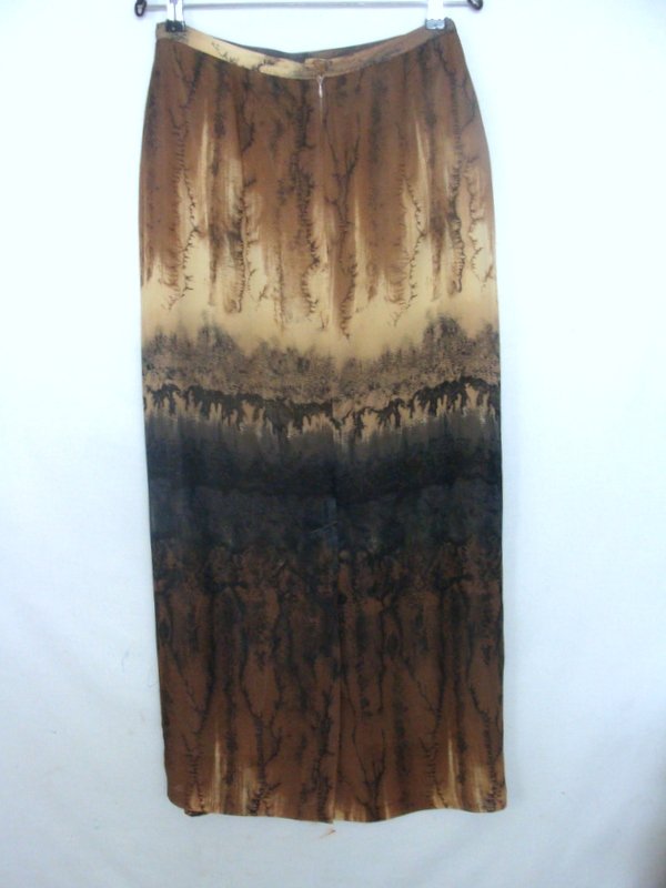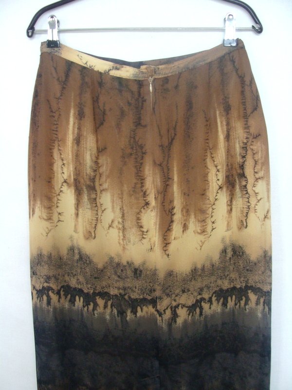 Wzorzysta, ołówkowa spódnica maxi z przewiewnej tkaniny wiskozowej w kolorach ziemi. Zapinana z tyłu na zamek, z rozcięciem u dołu. Na rozciągliwej dzianinowej podszewce.