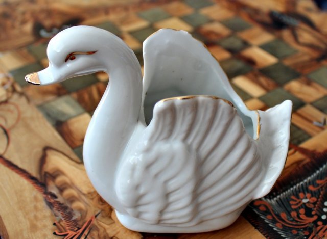 Biała porcelana z delikatnie zaznaczonymi złoceniami.