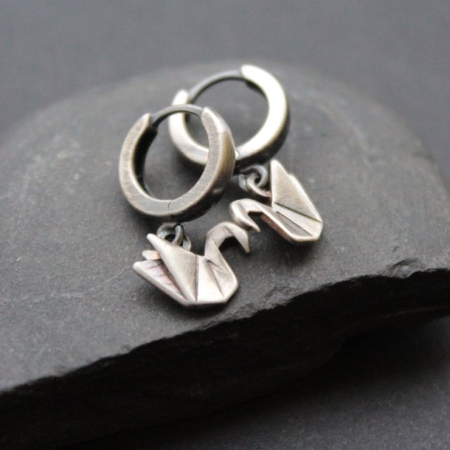 Kolczyki wykonane zostały z oksydowanego srebra próby 925 z ozdobnymi srebrnymi łabędziami wielkości 1,1 cm. Bigle kajdanki. Długość całkowita kolczyków 2,8 cm.
