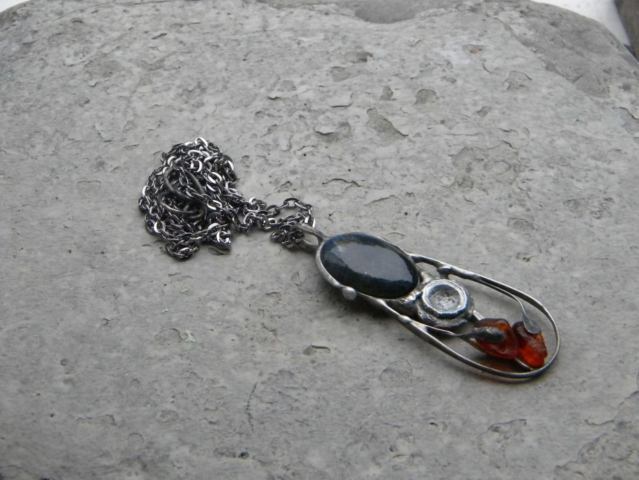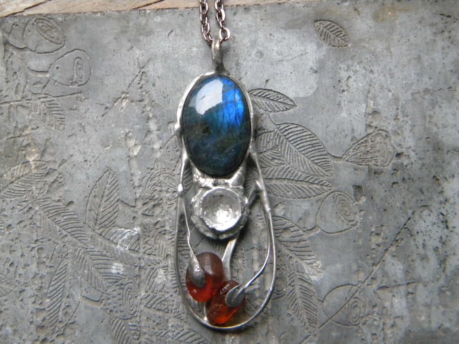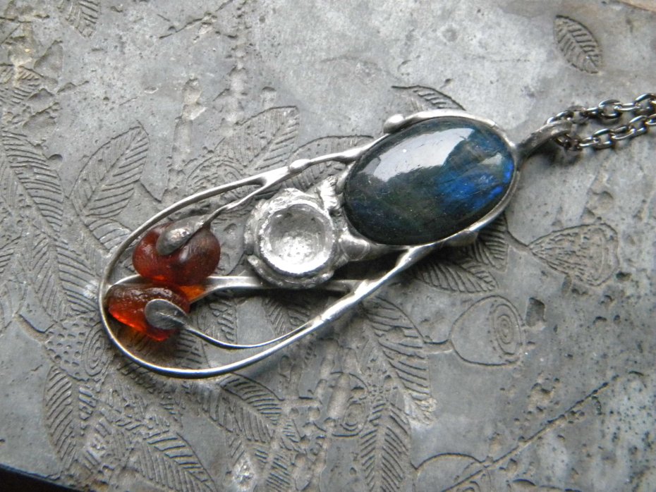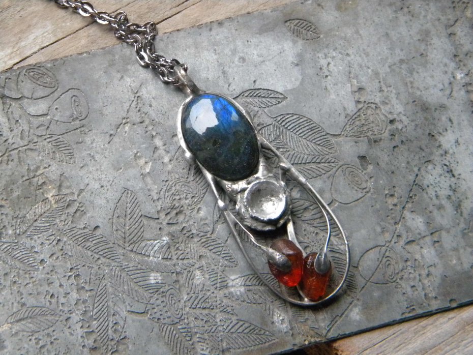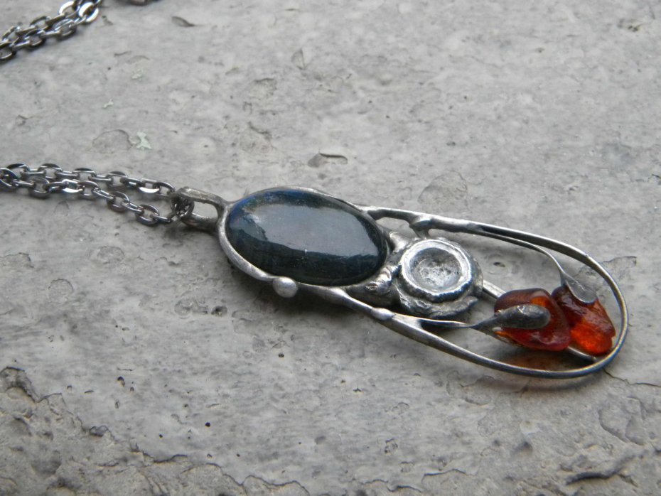 labradoryt i bursztyny w oprawie z ocynowanej miedzi