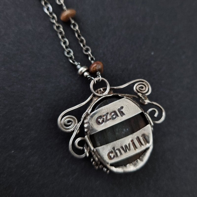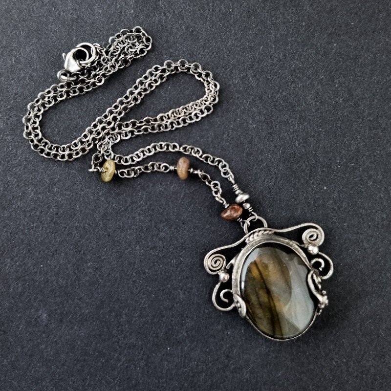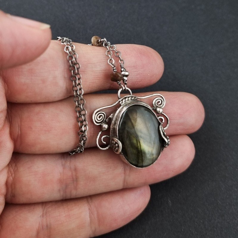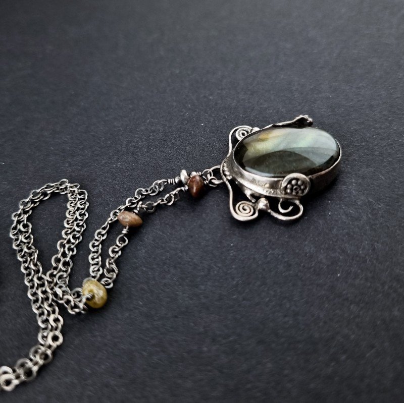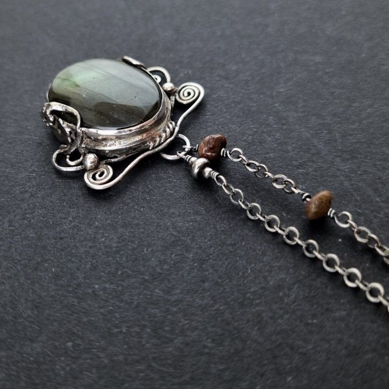 Cała praca została wykonana ręcznie z oksydowanego srebra prób 999 i 925. Proces oksydacji nadaje biżuterii subtelny, przyciemniony odcień, który doskonale komponuje się z naturalnymi barwami kamieni. Dodatkową ozdobą są małe oponki brązowego turmalinu, które wprowadzają delikatny akcent kolorystyczny, idealnie współgrający z labradorytem.