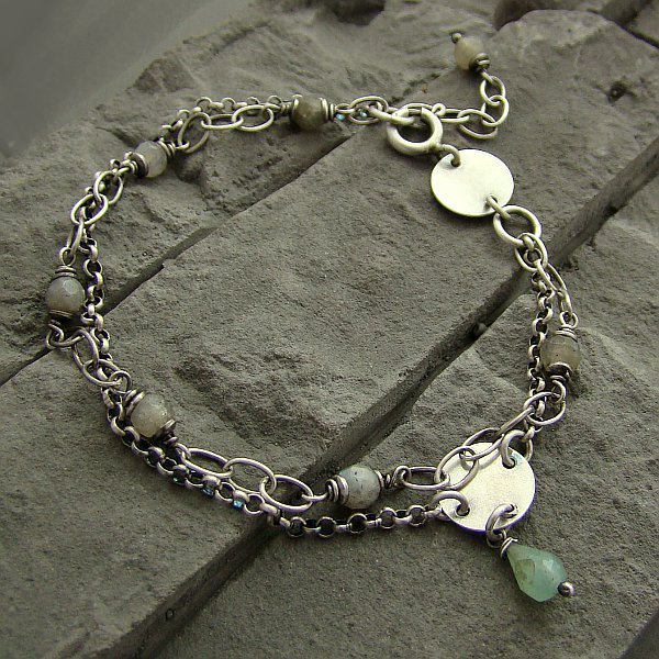 Delikatna, modna bransoletka na co dzień. Wykonana w całości z oksydowanego srebra próby 925 oraz fasetowanych kulek labradorytu wielkości 4 mm i kropelki chryzoprazu wielkości 6 mm. Ogniwka łańcuszka są wielkości 5,5 x 3,5 mm i 2,2 mm. Całkowita długość bransoletki regulowana od 18 cm do 20 cm. Ozdobnie zapakowana.