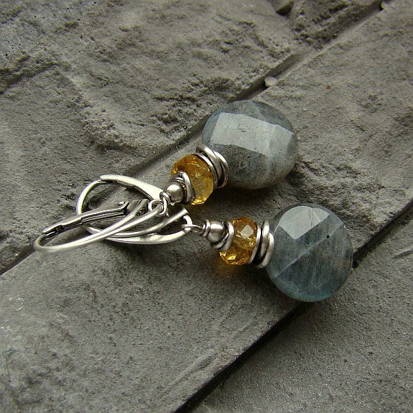 Modne, minimalistyczne, nowoczesne kolczyki odpowiednie na co dzień. Wykonane w całości z oksydowanego srebra próby 925 oraz fasetowanych monet labradorytu wiekości ok. 1,5 cm i fasetowanych oponek cytrynu wielkości 6 mm. Całkowita długość kolczyków to 4,5 cm. Ozdobnie zapakowane.