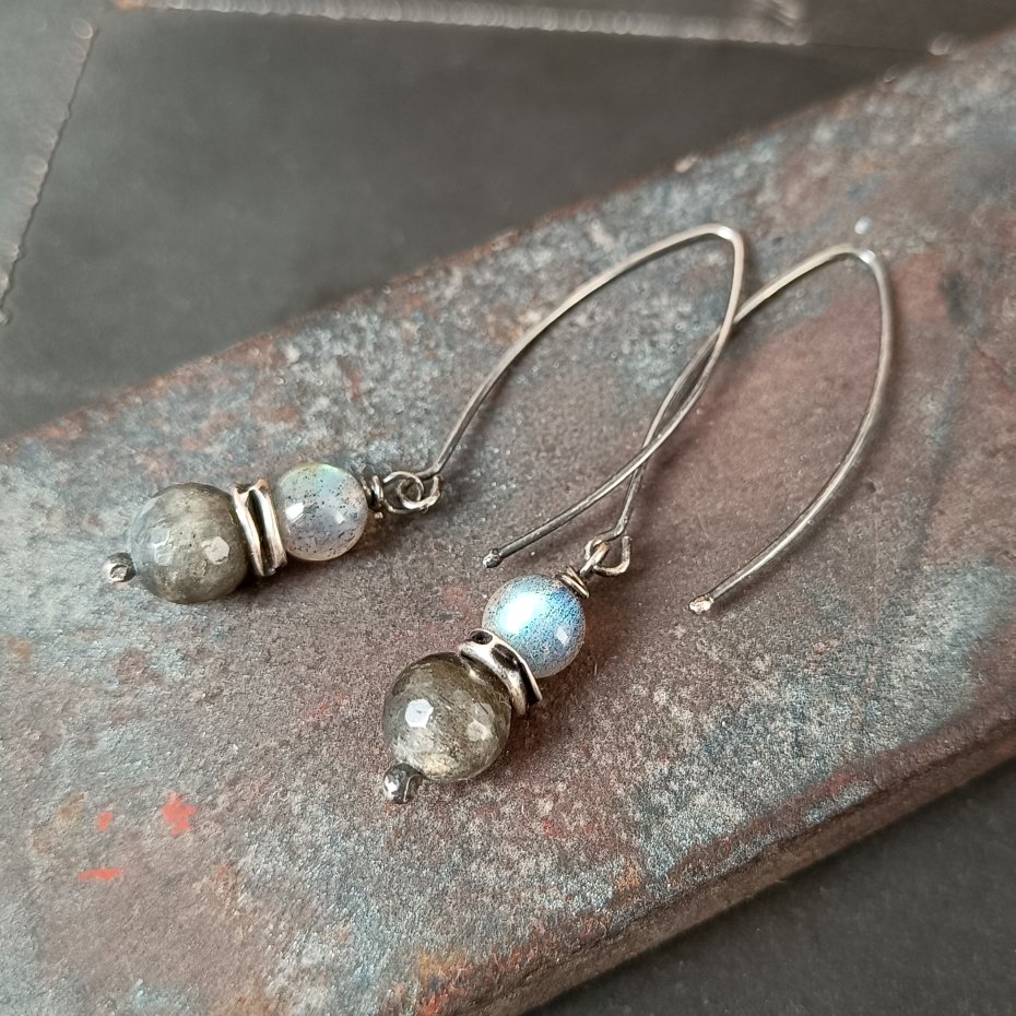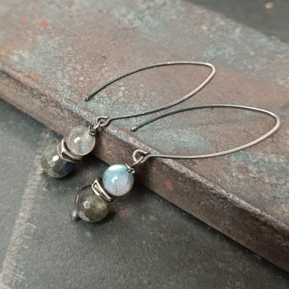 Kolczyki wykonane z gładkich kul naturalnego labradorytu (6 i 8 mm). Srebro próby 925, oksydowane i polerowane. Kolczyki na otwartych biglach typu "rybki". Subtelne i lekkie, a jednocześnie wyraziste – długość 5,5 cm, waga 1,5 g.