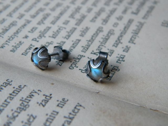 kolczyki z oksydowanego srebra 925 i labradorytów. średnica 8,5mm.kamienie lśnią błękitem.
