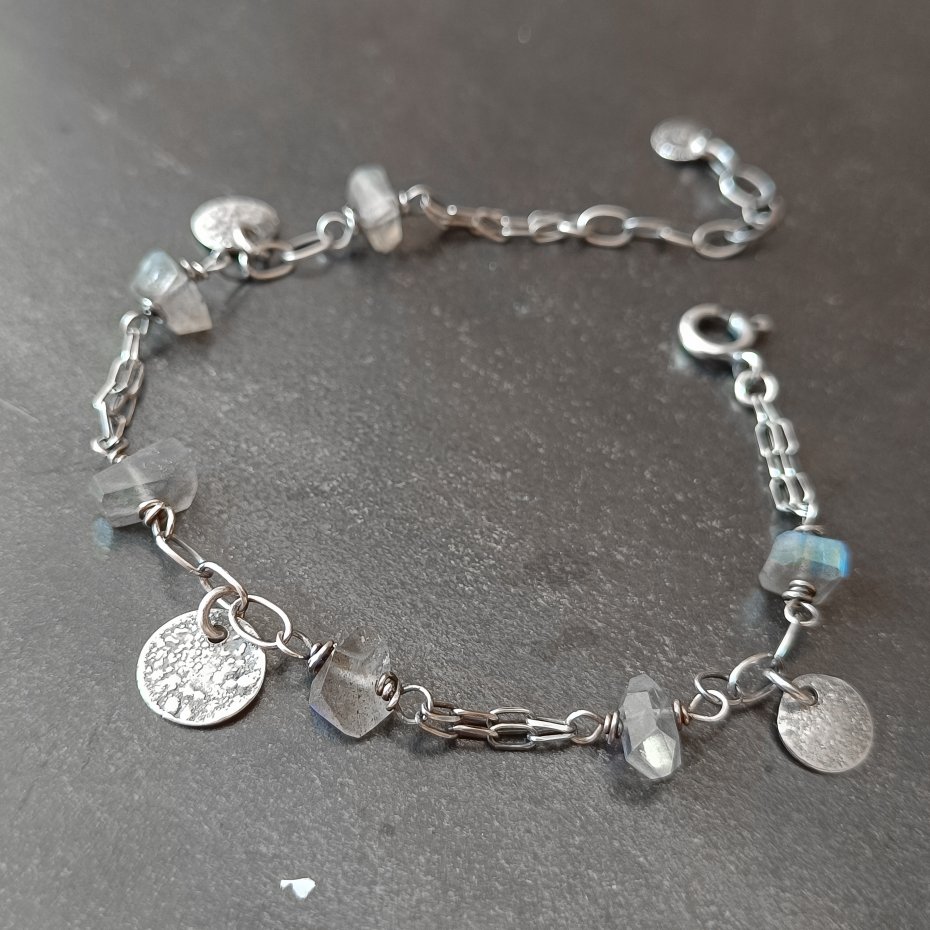Bransoletka została wykonana ze srebra próby 925 oraz naturalnego labradorytu.