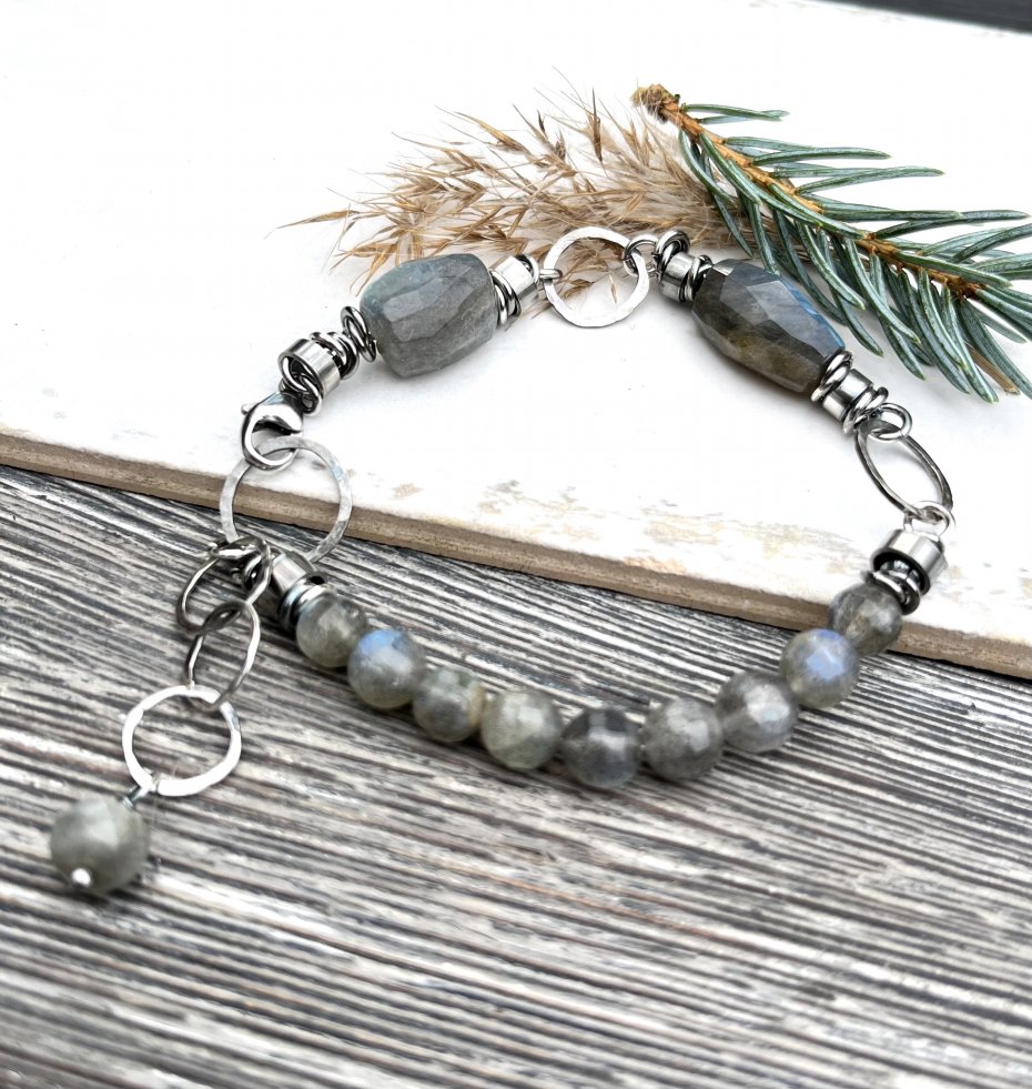 Bransoletka z labradorytem, wire wrapping, stal chirurgiczna, labradoryt
