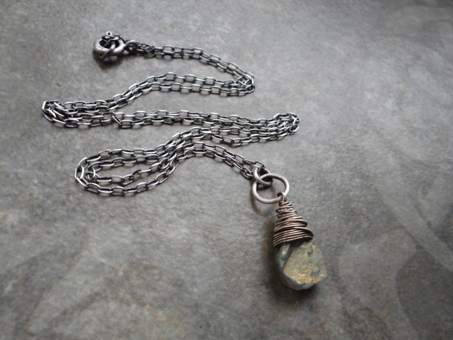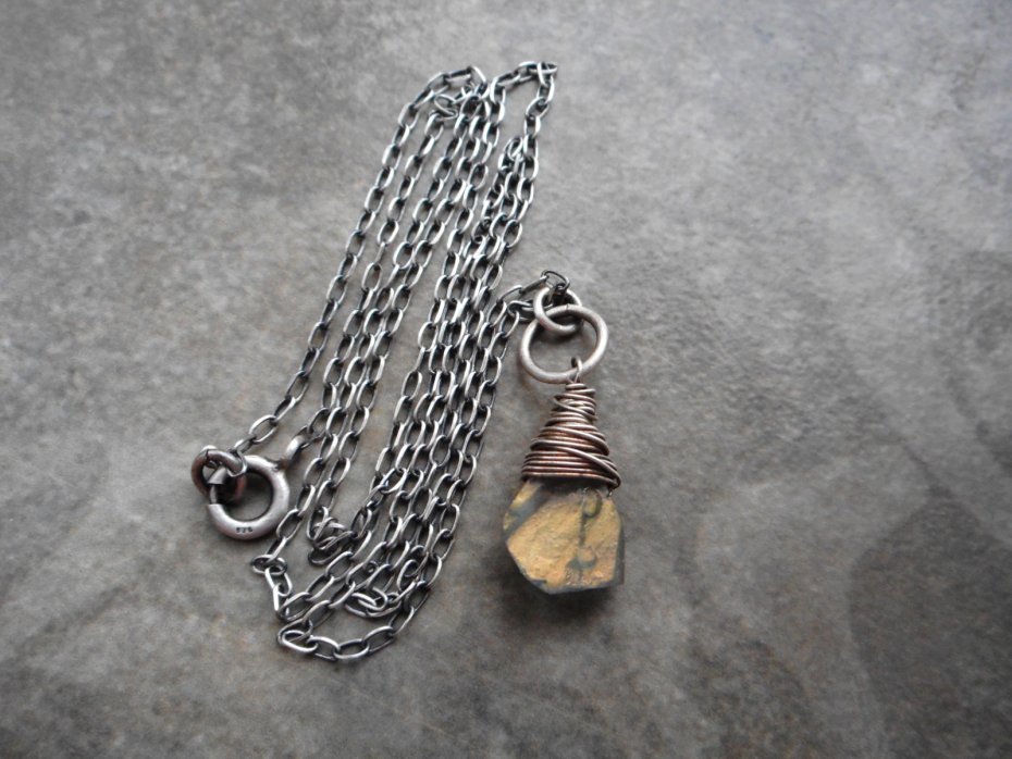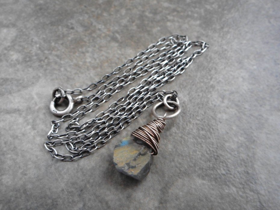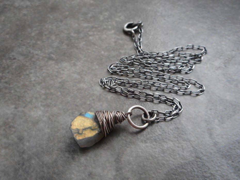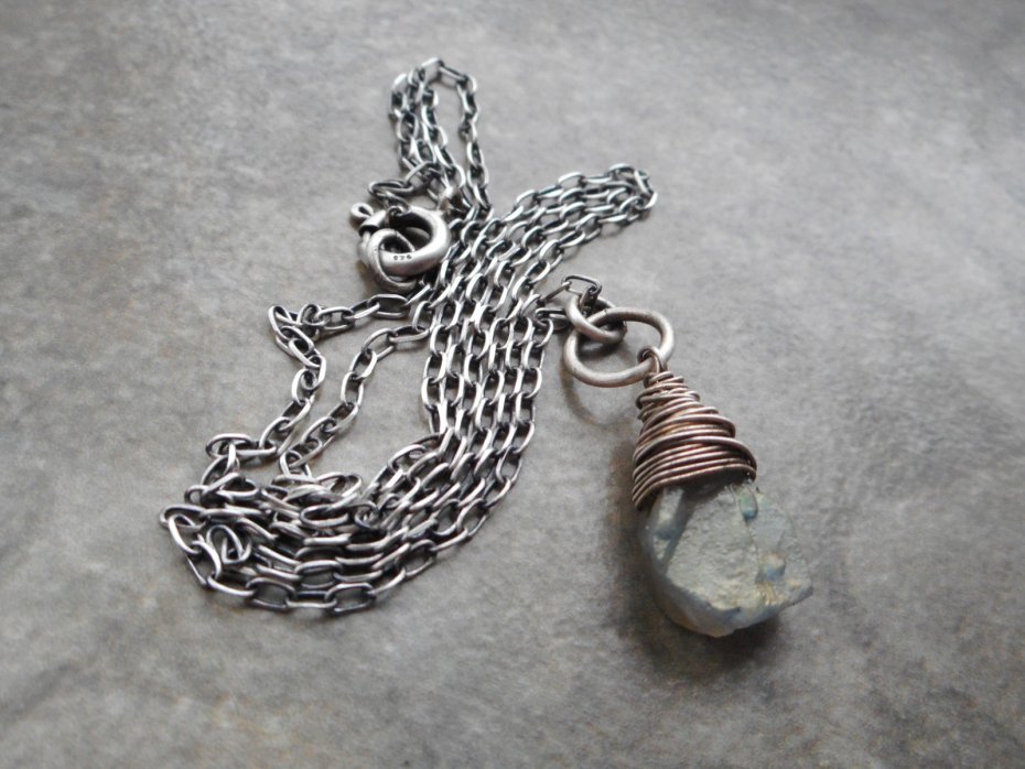 Naszyjnik z kamieni naturalnych i szlachetnego srebra; klasyczny wisiorek o surowym charakterze.