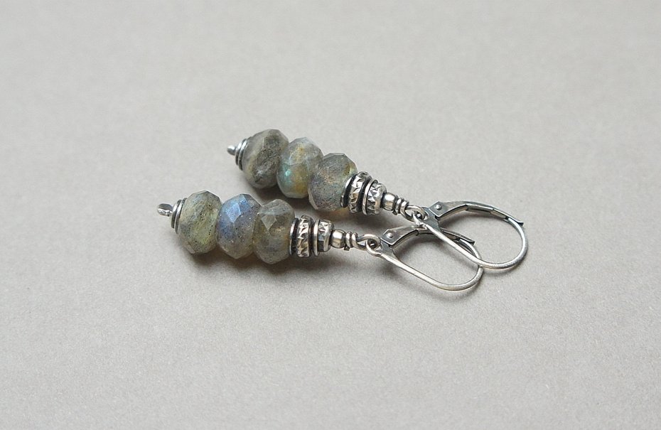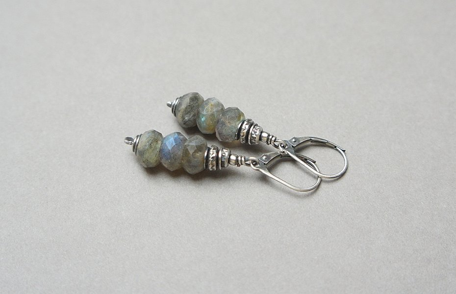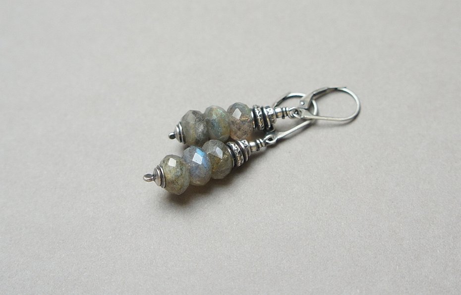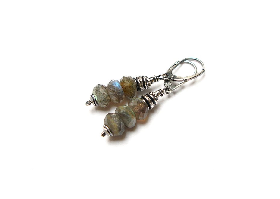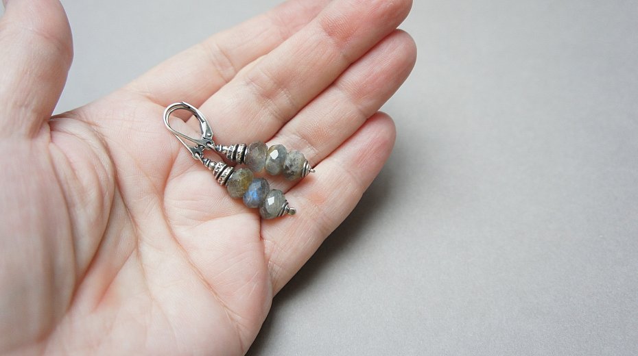 Kolczyki wykonane ze srebra [pr.925] w połączeniu z fasetowanymi oponkami labradorytów [9mm]. Całość oksydowana i przetarta. Całkowita długość kolczyków 4,7cm. Biżuteria ozdobnie zapakowana.