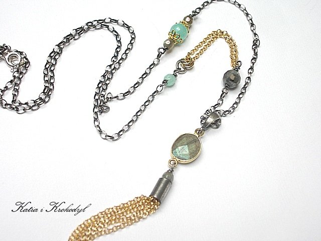 Długi naszyjnik wykonany ręcznie ze srebra i srebra pokrytego 24k zlotem [pr.925] w połączeniu z labradorytem w okuciu [10mm], fasetowanymi kuleczkami labradorytów mystic [4 i 6mm], fasetowaną kuleczką jadeitu [4mm], kuleczką marmuru [6mm]. Srebro częściowo oksydowane i przetarte. Całkowita długość łańcuszka [bez wiszącej części] 63cm. Długość wiszącej części wraz z krawatką 11cm. Biżuteria ozdobnie zapakowana