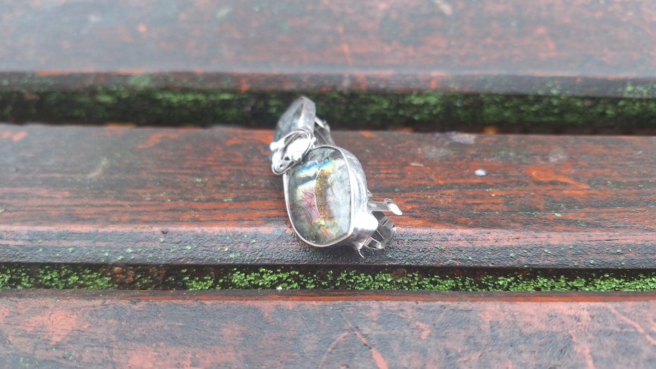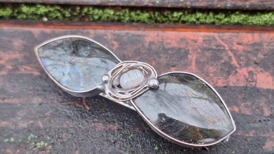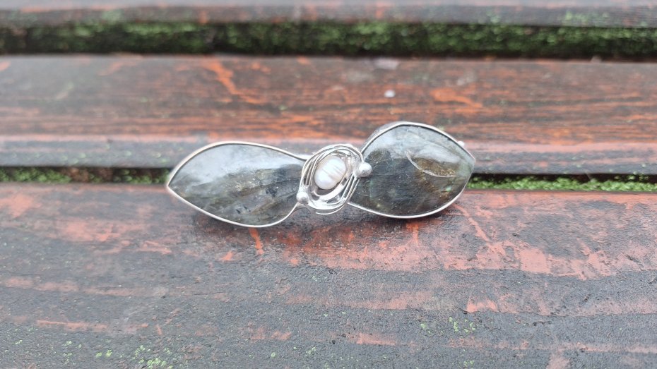 Klamra do włosów, wykonana z miedzi, cyny, perły i labradorytów. Wymiary ok. 8 na 2.5 cm. Zapięcie 6 cm, metalowe.