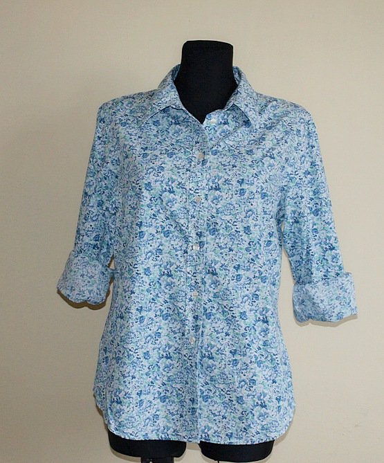 Śliczna koszula ze sztywniejszej, drukowanej w niebiesko zielone kwiatuszki bawełny. Marka Next. Stan bardzo dobry, prawdopodobnie nieużywana. Rozmiar z metki 16, ale na mniejszych rozmiarach wygląda bardzo dobrze. Podaję wymiary mierzone na płasko;