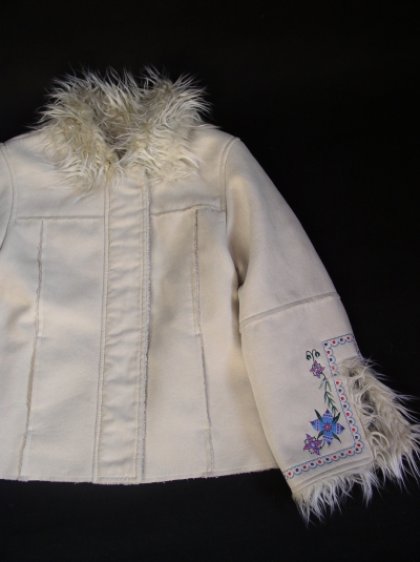 Kożuszek lekki,miękki ze sztucznego baranka,firmy Ladybird.Rozmiar 7-8 lat -128 cm.wzrostu.Zapinany z przodu na zamek + napy.Dwie boczne kieszenie.Kołnierz z długim włosem.Rękaw długi,zakończony mankietem obszytym włoskiem + haft kwiatowy i ozdobny szlaczek.Stan bardzo dobry.Długość 48 cm.pod pachami 80 cm.
