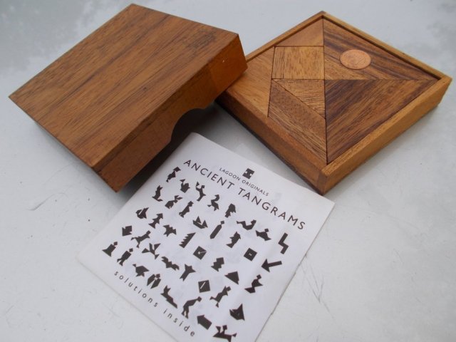 Układanka jakże oryginalna i ciekawa gra logiczna. Sygnowana LAGOON GAMES / na monecie wtopionej w drewniany klocek/. Siedem klocków - a można stworzyć 41 figur. Fantastyczne!!!! Bardzo dobrze wykonane ze szlachetnego egzotycznego drewna, w oryginalnym również drewnianym pudełeczku z karteczką - ściągaweczką. Wykończenie satynowe, naturalnie olejowane.