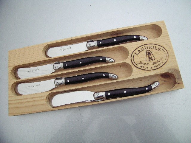 Zestaw czterech Designerskich i Jakościowym nożyków renomowanej Francuskiej firmy LAGUIOLE. Z sygnaturami Laguiole na nożykach i pudełku - Laguiole Jean Dubost Made in France. Ciekawy design, jakość zarówno stali jak i mocnej, twardej masy z której zostały wykonane uchwyty - dodatkowo dla bezpiecznego użytkowania nitowane i ozdobione uroczą muchą. Metalowa końcówka; Ładny,poręczny kształt. W oryginalnym drenianym pudelku - brak tylko foll celofanowanej w jaką były oryginalnie zapakowane. Zabezpieczam - przezroczystą folią streczową.