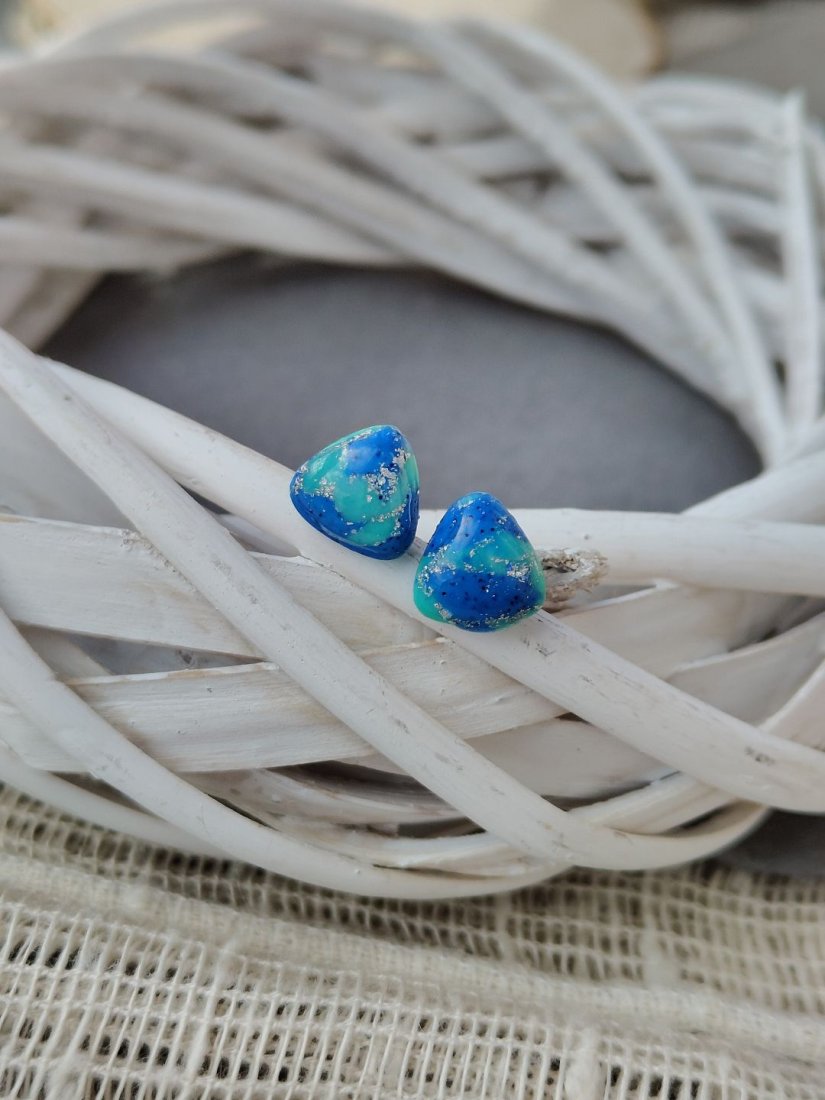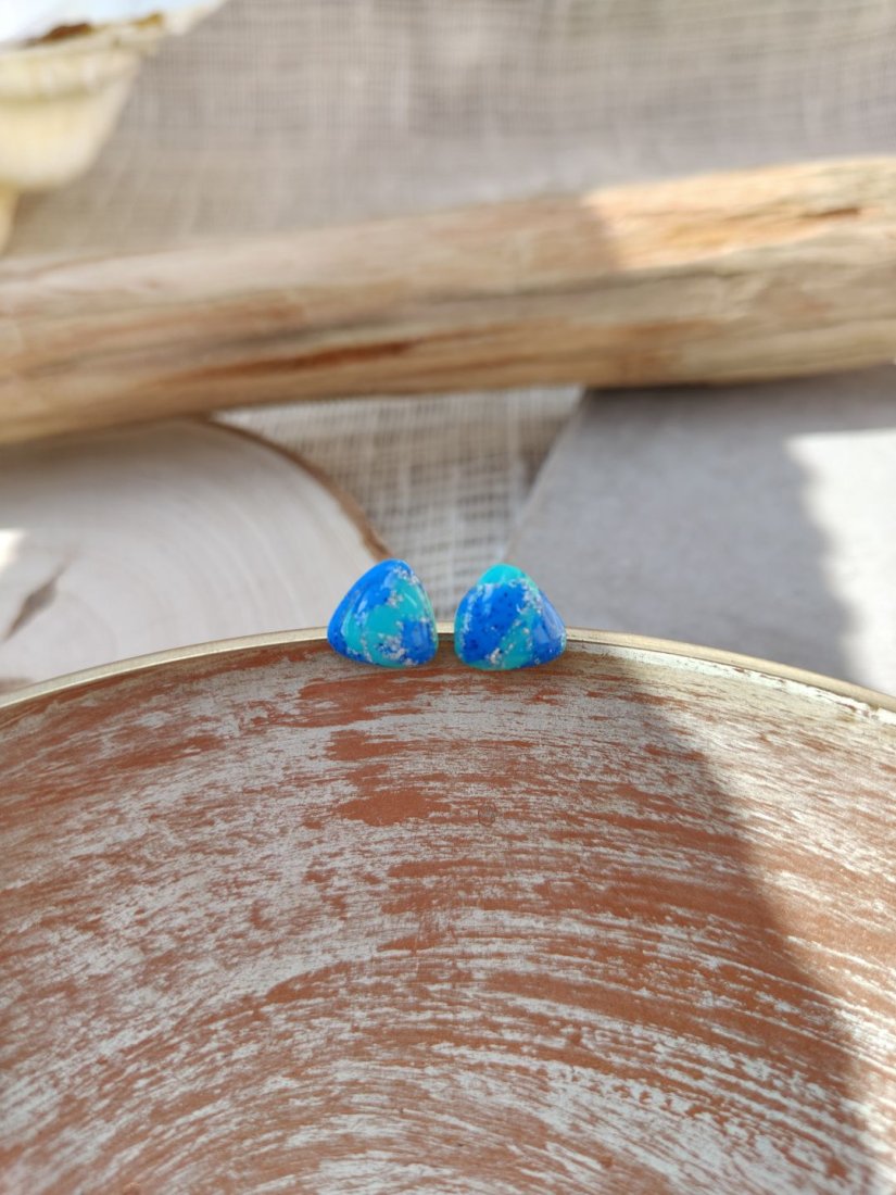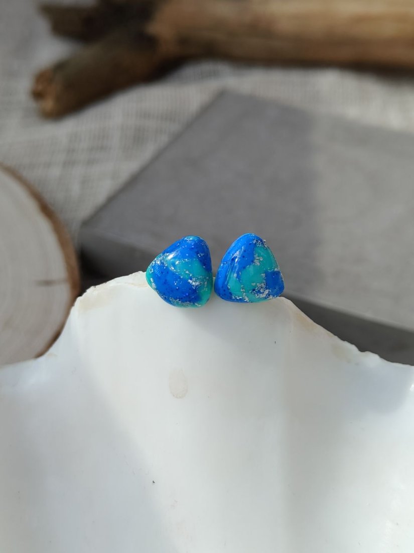 Zanurz się w głębi morskich inspiracji dzięki wyjątkowym kolczykom w kształcie trójkąta. Ich hipnotyzujące odcienie błękitu i turkusu, przełamane delikatnym połyskiem drobinek, przywodzą na myśl spokojne fale oceanu i letnie dni nad wodą. Każda para jest ręcznie wykonana, co sprawia, że kolczyki są niepowtarzalne i pełne artystycznego charakteru. To idealny dodatek dla osób, które kochają subtelną elegancję z nutą świeżości i koloru.