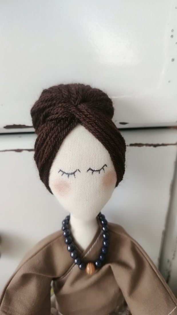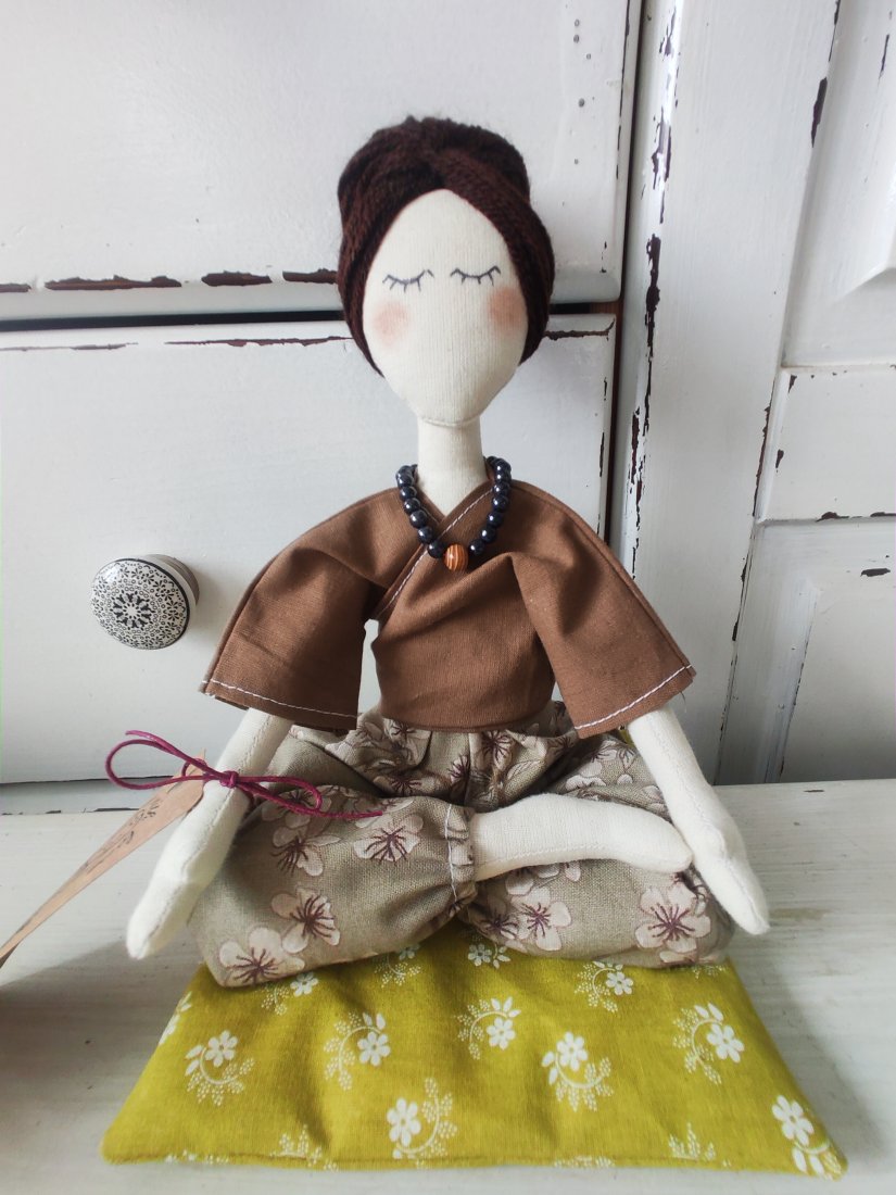 Lala w pozycji kwiatu lotosu. Wykonana z bawełny, wypełniona kulką silikonową. Dobry pomysł na prezent.