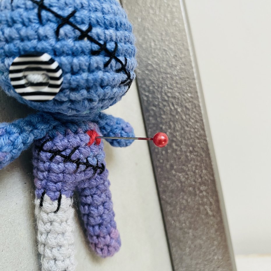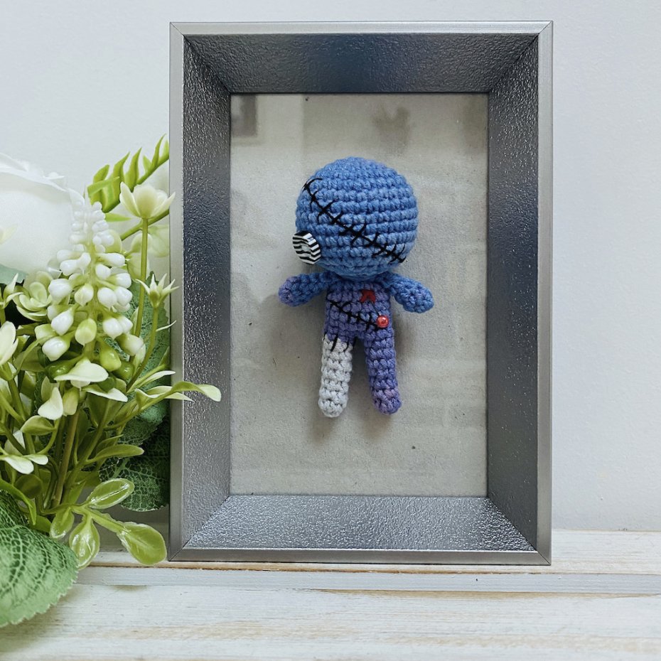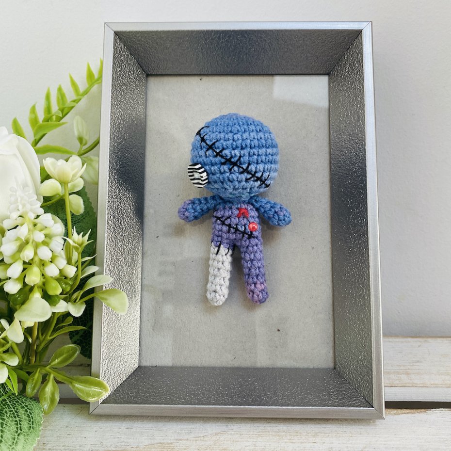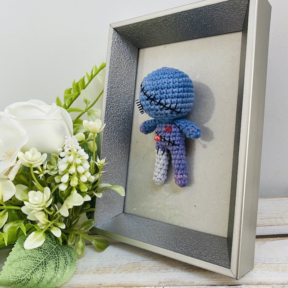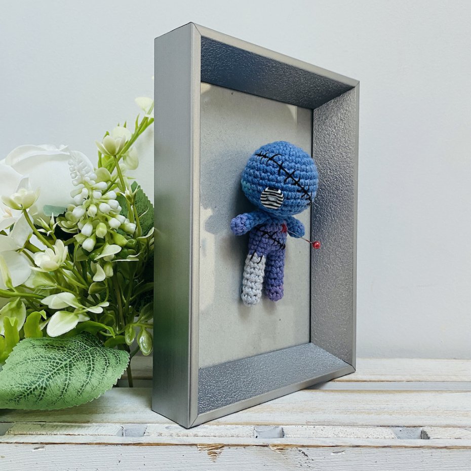 Ta ręcznie robiona na szydełku laleczka voodoo w eleganckiej ramce to idealny miks magii, humoru i designu.