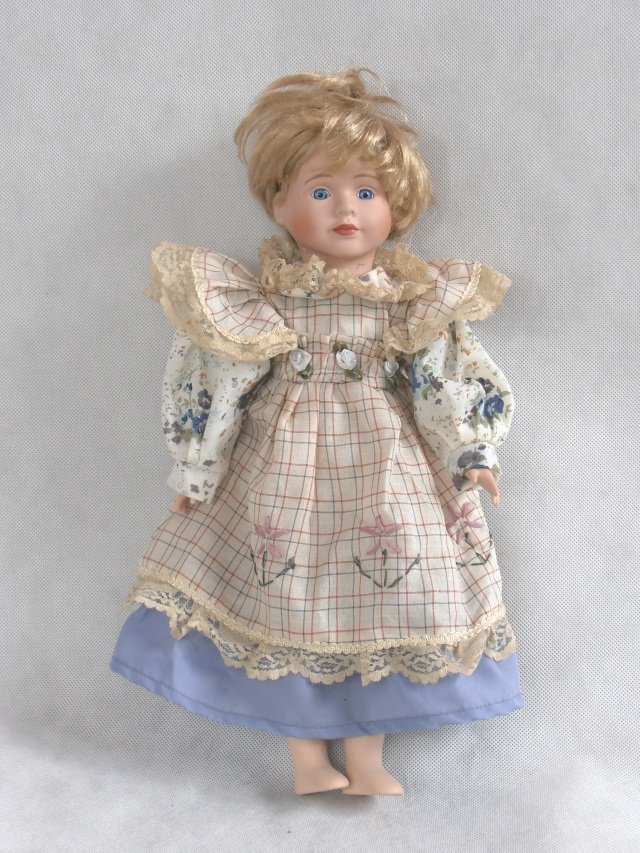 Lalka kolekcjonerska,stojąca.Włosy krótkie,blond.Oczka otwarte na stałe.Główka,rączki i nóżki porcelanowe.Ładna sukienka zapinana z tyłu na rzep.Stan dobry-brak bucików,plama na sukience w kroku małe rozprucie.Wysokość 40 cm.
