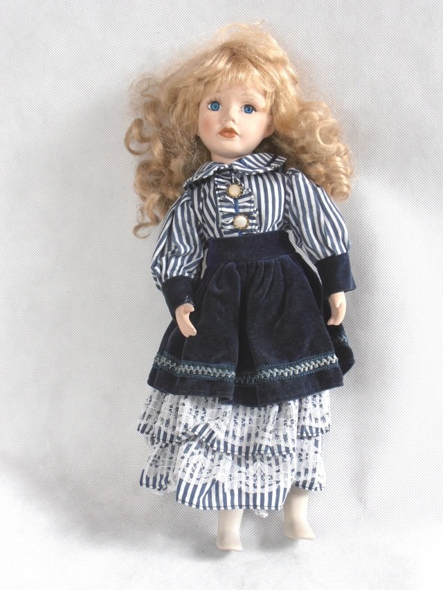 Lalka kolekcjonerska.Długie włosy bond.Oczka otwarte na stałe.Główka,nóżki i rączki porcelanowe.Tułów z białego płótna.Stan dobry+brak bucików.Wysokość 40 cm.