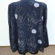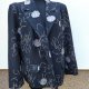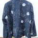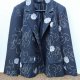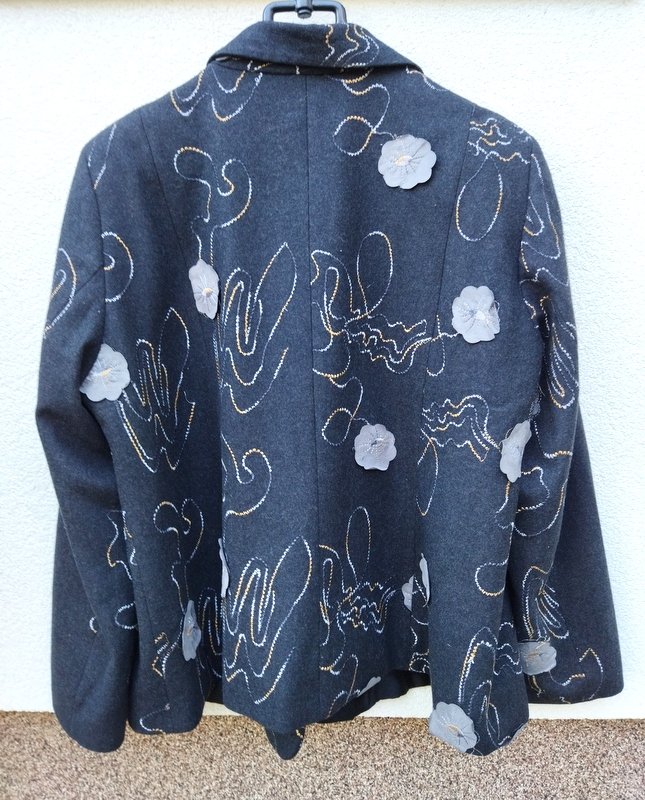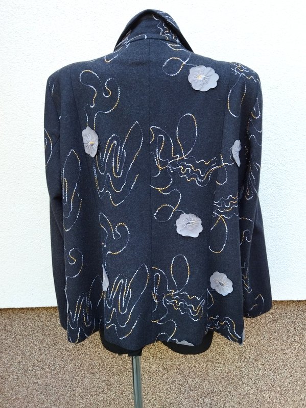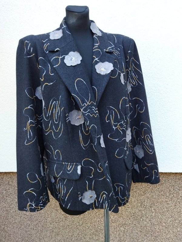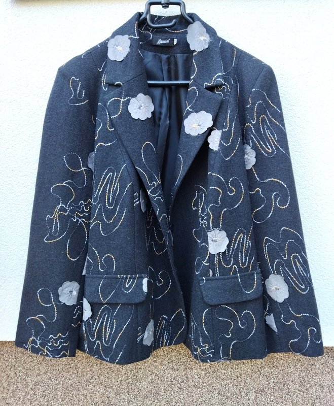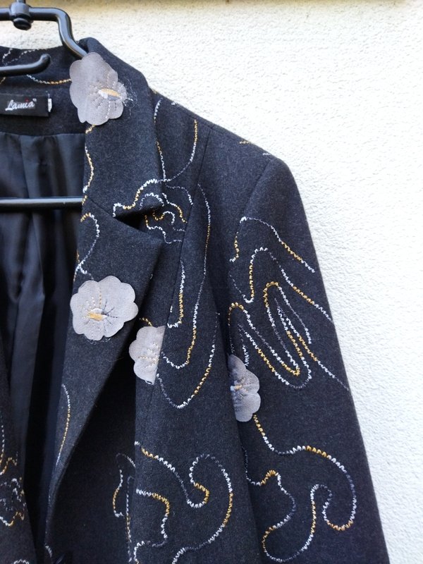 Ładna marynarka z flauszowej tkaniny w grafitowym kolorze haftowana biało-żółto- szarymi haftami z naszywanymi kwiatowymi aplikacjami w gołębim kolorze . Z kołnierzem z rewersami z dwiema naszywanymi patkami imitującymi kieszenie. Zapinana na trzy guziki. Całość na podszewce.