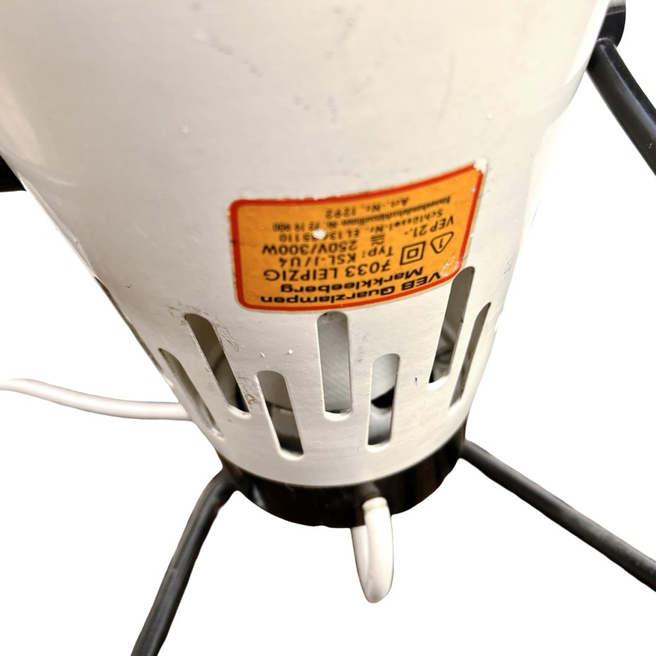 Lampa medyczna (z żarówką emitującą światło podczerwone- sprawna, dołączana do zestawu) wyprodukowana przez VEB Quarzlampen Markleeberg w Niemczech w latach 60. Lampa może służyć również jako lampa podłogowa lub biurkowa tworząc ciekawy nastrój. (Wystarczy w tym celu jedynie wymienić oryginalną żarówkę na żarówkę emitującą zwykłe światło). Gwint na żarówkę E27.