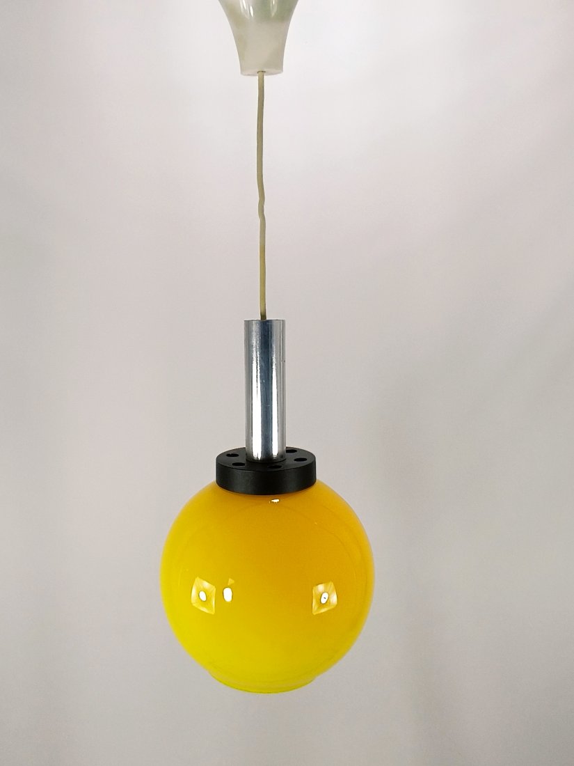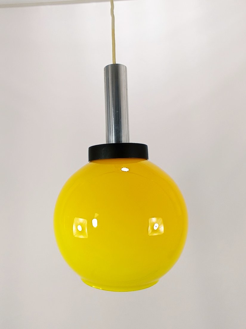 Lampa sufitowa 'Gliwice' z czasów prl-u. Szklany, żółty klosz w kształcie kuli jest w bardzo dobrym stanie, zachowany bez uszkodzeń. Na powierzchni klosza występuje jedynie niewielkie zarysowanie pokazane na ostatnim zdjęciu. Klosz jest w intensywnym żółtym odcieniu, po podświetleniu daje ciepłe pomarańczowe światło. Wysokość całkowita 70 cm. Średnica klosza 22 cm.