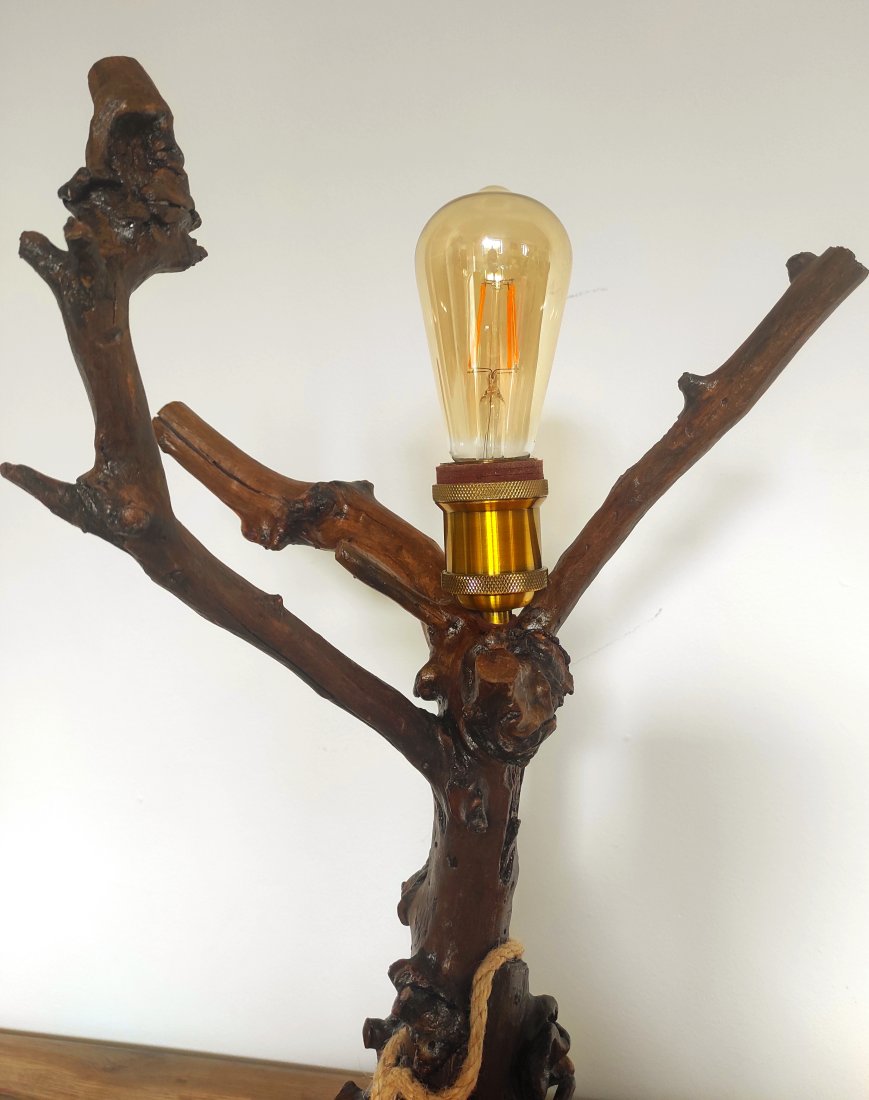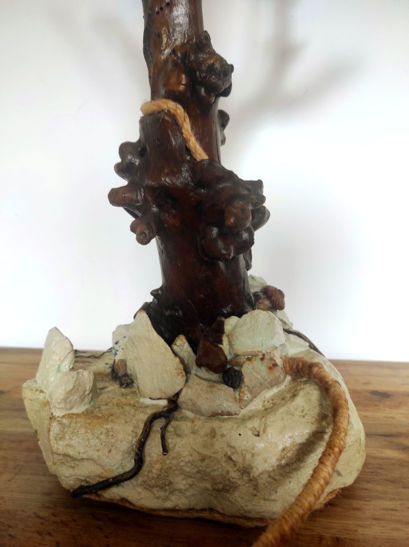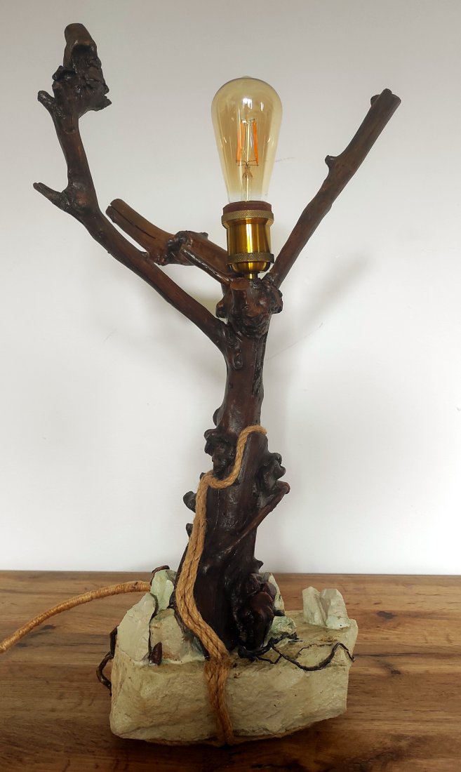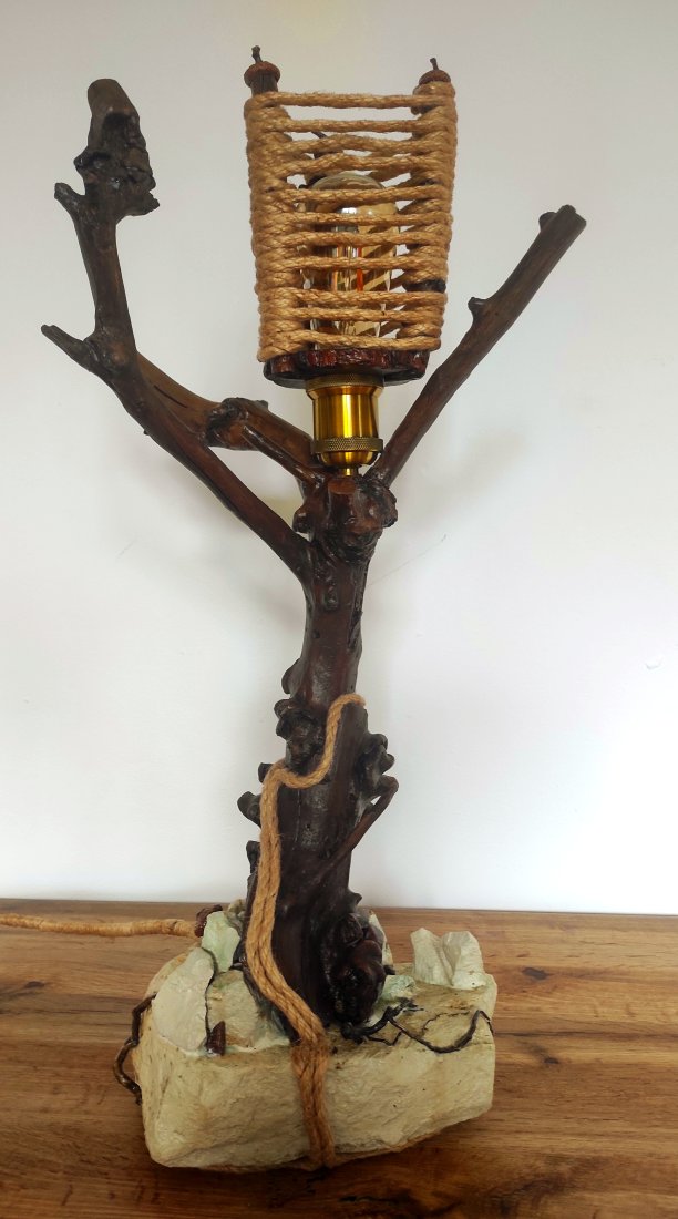 ✅ Materiały: drewno (gałąź), kamień, juta, metal, przewód w oplocie