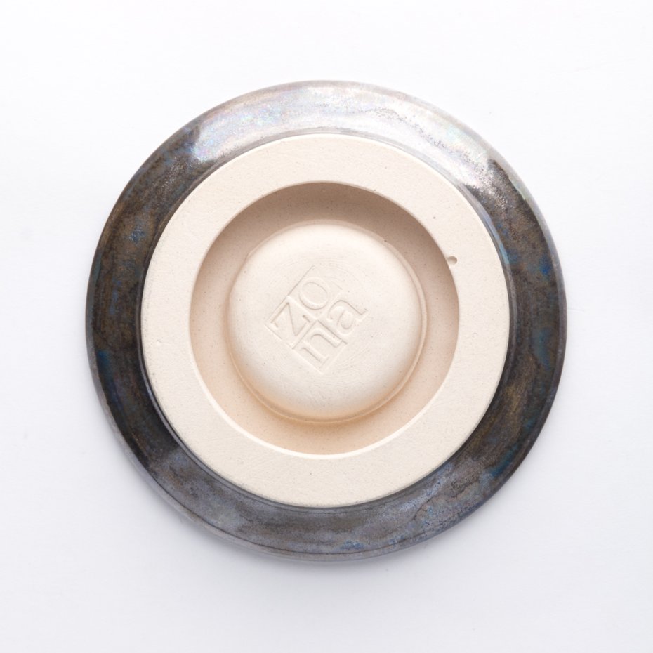 Ceramiczny, okrągły lampion (świecznik) z lekko wypukłym dekoracyjnym ornamentem. Wykonany z jasnej gliny, pokryty szkliwem o satynowym połysku. Od spodu sygnowany. Polecam serdecznie.
