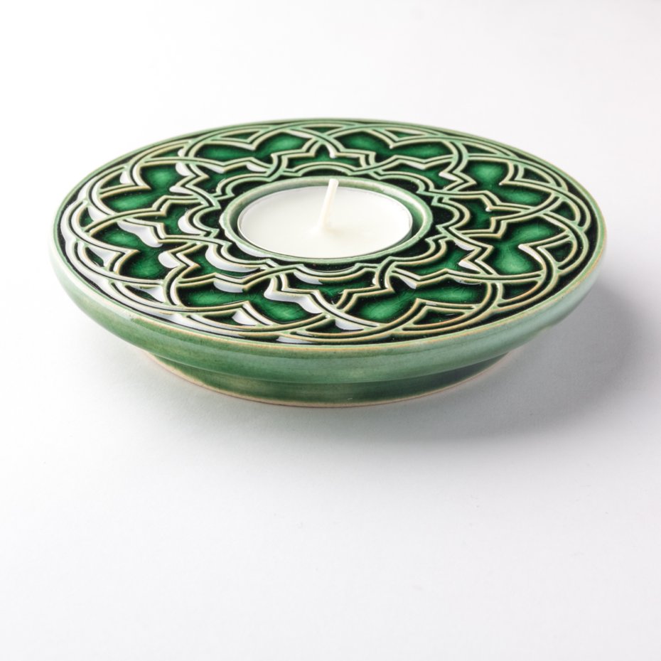 Ceramiczny, dekoracyjny lampion (świecznik) na tealighty z lekko wypukłym, geometrycznym ornamentem. Ręcznie wykonany z jasnej gliny, ręcznie szkliwiony. Polecam serdecznie.