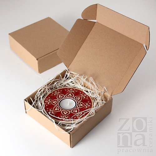 Lampion (świecznik) ornamentowy z motywem serca + opakowanie prezentowe. Wykonany z jasnej gliny. Górna powierzchnia i wnętrze pokryte błyszczącym, efektowym, czerwonym szkliwem. Wypalony w temp 1150*C. Średnica wewnętrzna (43 mm) pozwala na stosowanie małych świeczek ozdobnych, zapachowych i tealightów. Cena obejmuje 1 lampion + 1 tealight + opakowanie prezentowe. Wymiary: wysokość 2,5cm, średnica 12,5cm. Od spodu sygnowany. Polecam serdecznie.