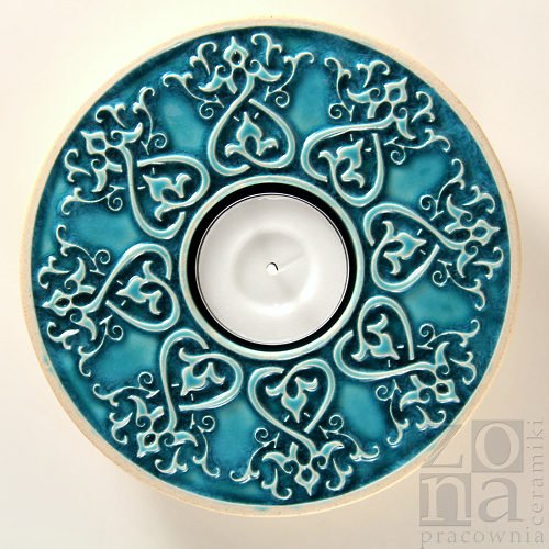 Lampion (świecznik) ornamentowy z motywem serca, wykonany z jasnej gliny. Górna powierzchnia i wnętrze pokryte błyszczącym szkliwem efektowym, turkusowym. Wypalony w temp 1150*C. Średnica wewnętrzna (43 mm) pozwala na stosowanie małych świeczek ozdobnych, zapachowych i tealightów. Cena obejmuje 1 lampion + 1 tealight. Wymiary: wysokość 2,5cm, średnica 12,5cm. Od spodu sygnowany. Polecam serdecznie.
