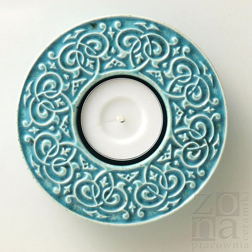Lampion (świecznik) z ozdobnym, lekko wypukłym ornamentem. Wykonany z jasnej gliny. Pokryty błyszczącym, turkusowym szkliwem, z efektem drobnych ciemnych plamek. Wypalony w temp 1150*C. Średnica wewnętrzna (43 mm) pozwala na stosowanie małych świeczek ozdobnych, zapachowych i tealightów. Cena obejmuje 1 lampion turkusowy + 1 tealight. Wymiary: wysokość 2cm, średnica 10cm. Od spodu sygnowany. Polecam serdecznie.