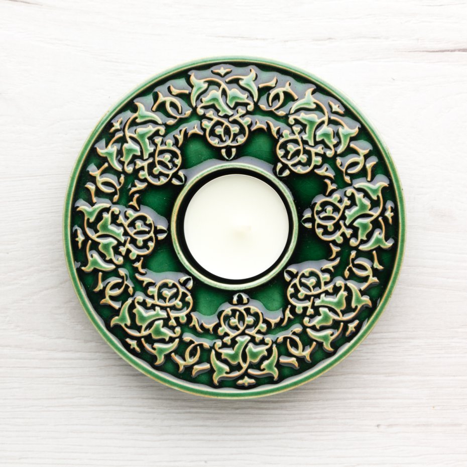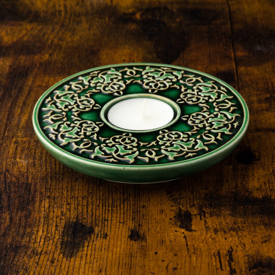 Ceramiczny, dekoracyjny lampion (świecznik) na tealighty z lekko wypukłym, roślinnym ornamentem. Ręcznie wykonany z jasnej gliny, ręcznie szkliwiony. Polecam serdecznie.