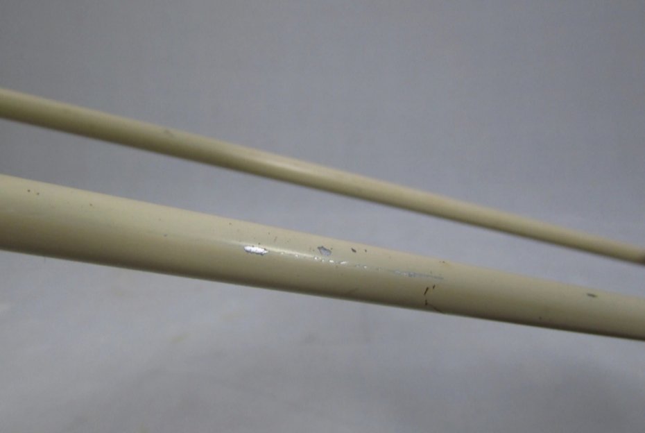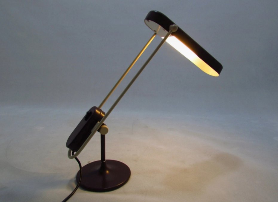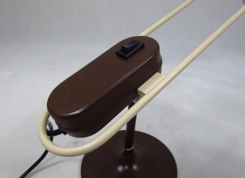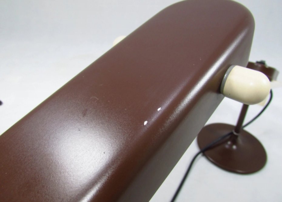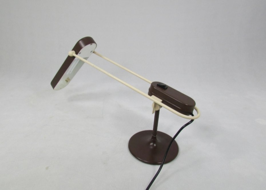 Metalowa lampka biurkowa w odcieniach brązu i beżu z lat 70. Lampkę można dowolnie ustawiać. Jest sprawna. Miejscami występują drobne ubytki lakieru pokazane na zdjęciach.