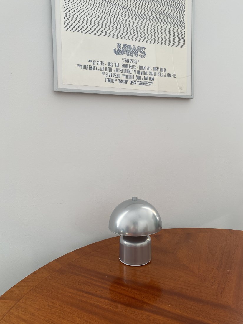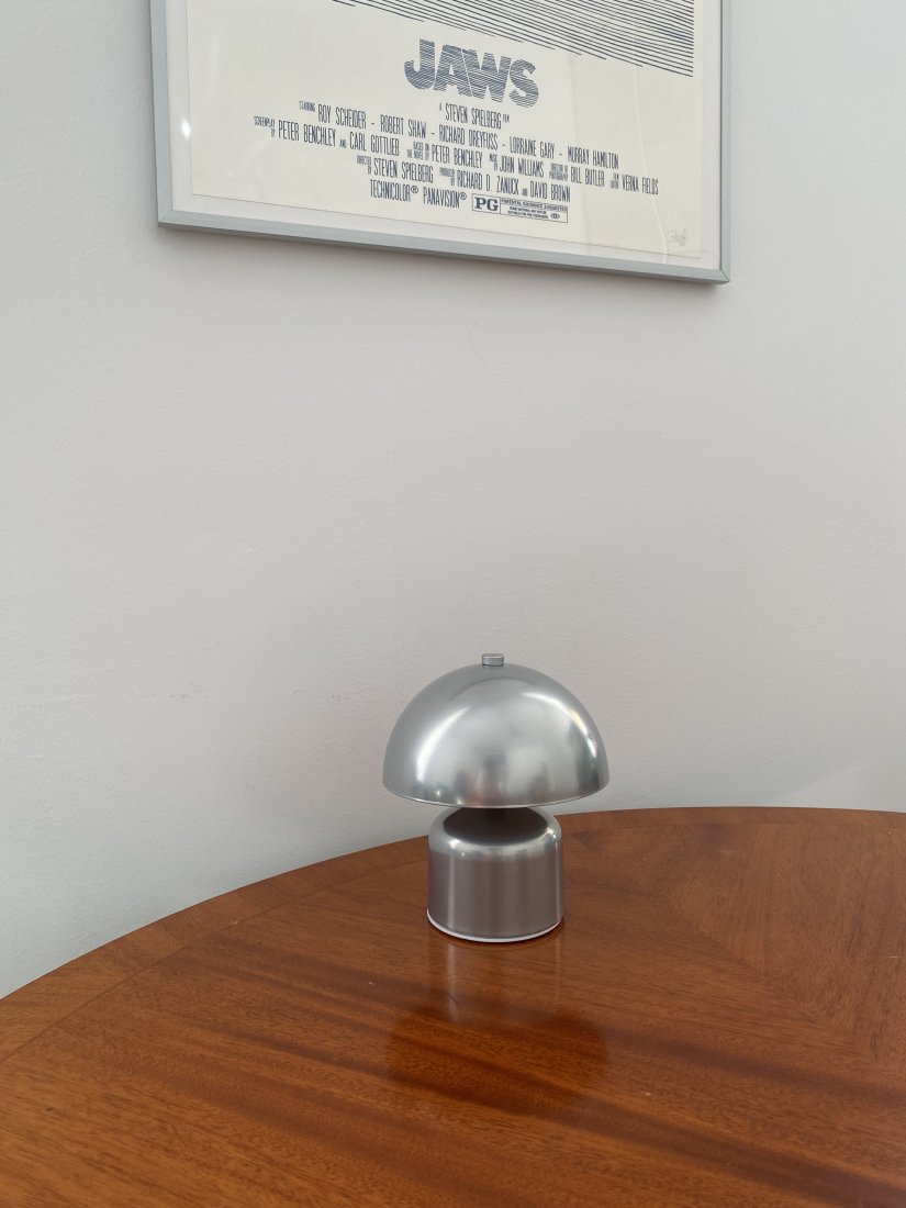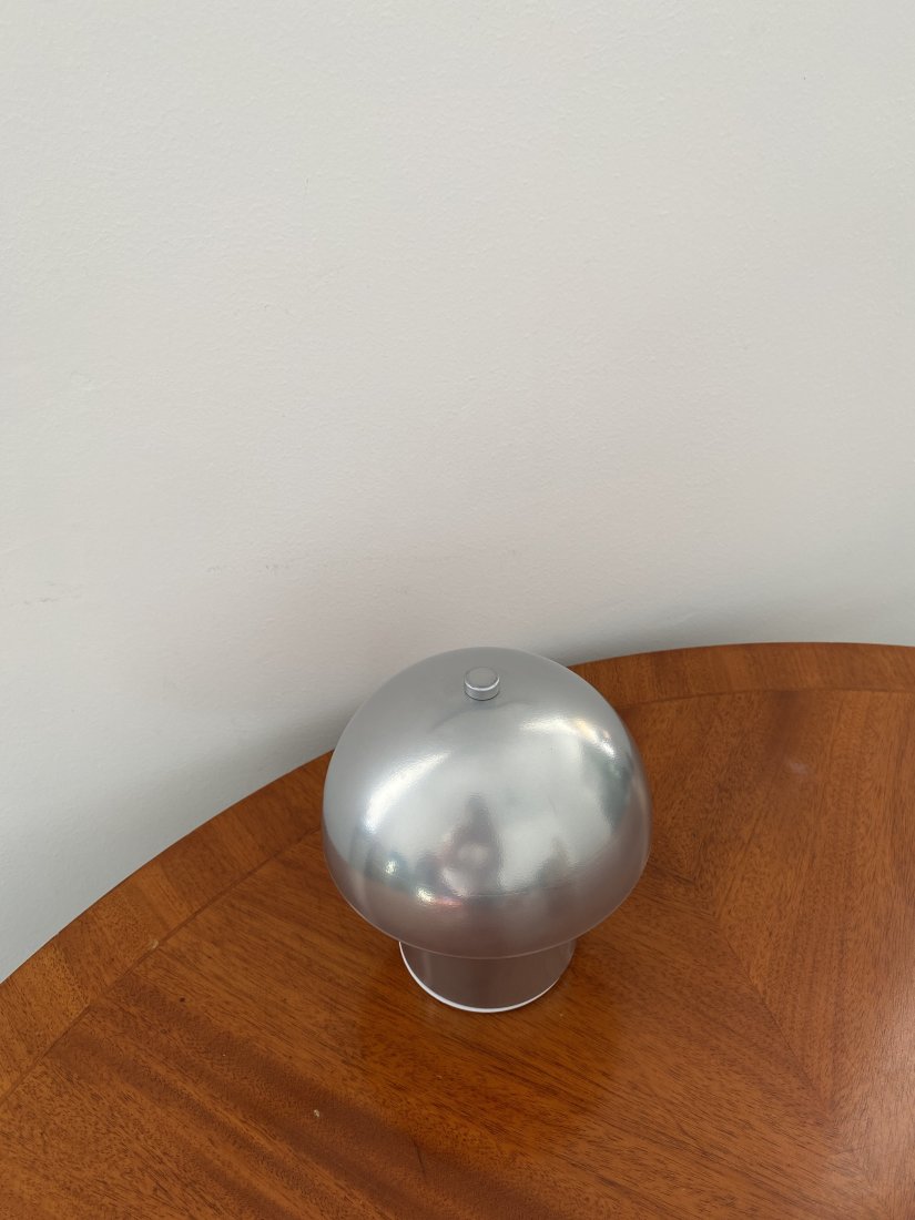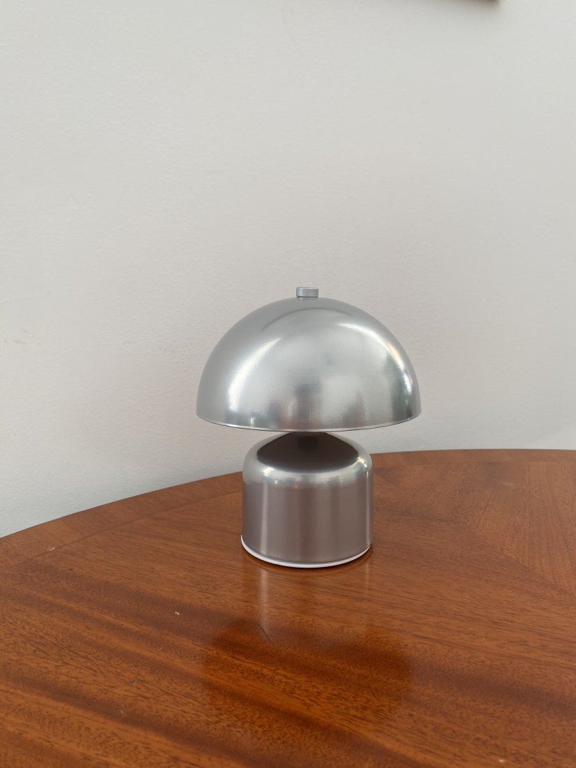 Metalowa lampka LED w kształcie grzybka w srebrnym kolorze. Na 3 baterie AA.