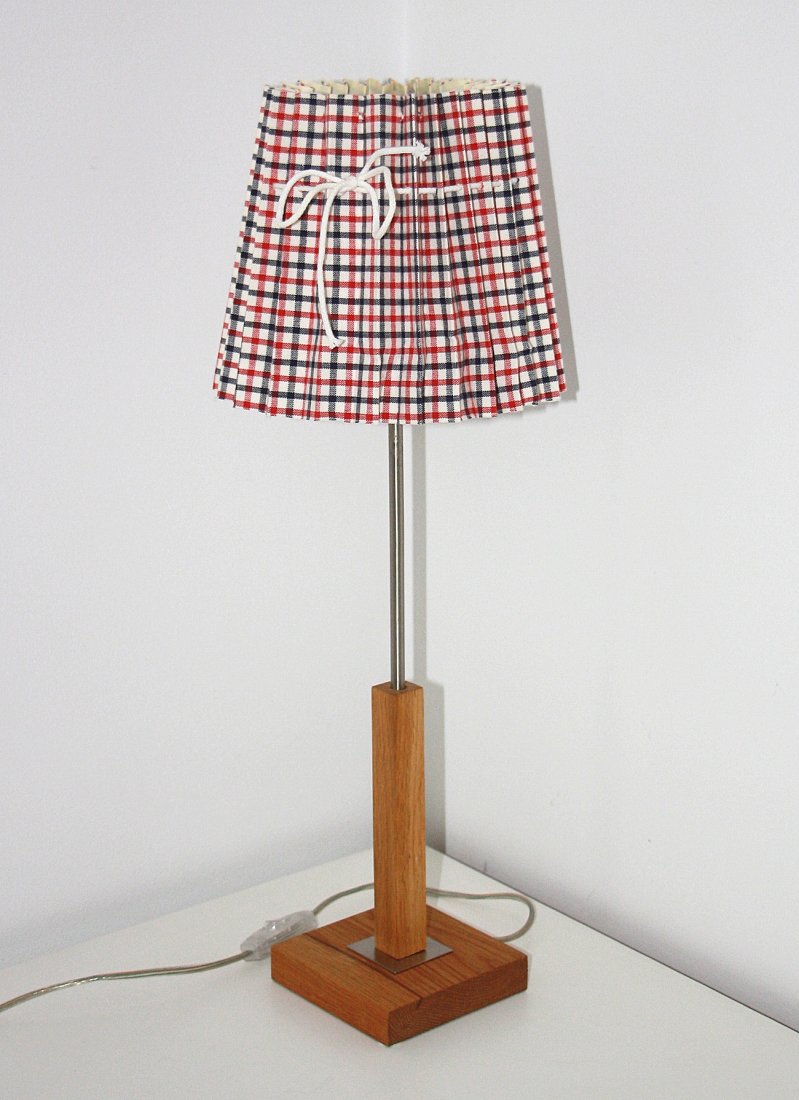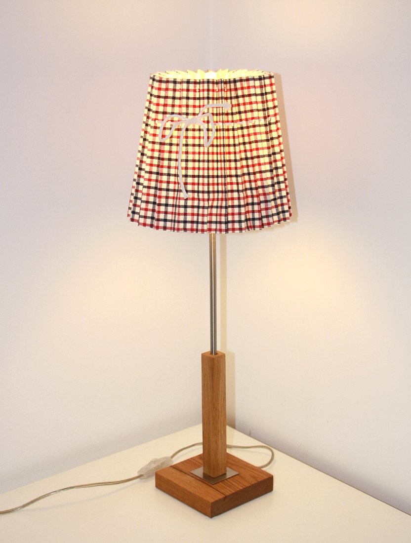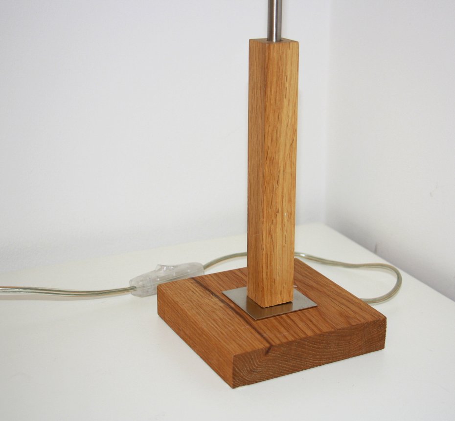 Stojąca lampka z abażurem. Podstawa wykonana z drewna. Świetna jako lampka nocna lub dekoracyjna stojąca lampa. Żarówka E14.