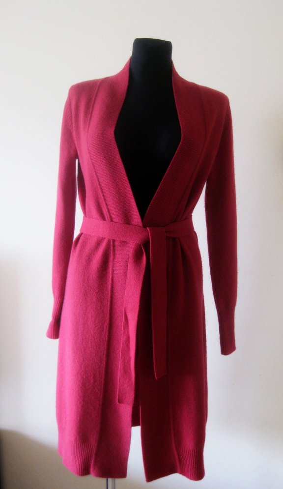 kardigan marki The Barn, w pięknym malinowym kolorze. Materiał 100% miękka wełna owcza. Dodatkowo pasek do przewiązania. Niewielkie ślady użytkowania. Od spodu w 2 miejscach przy brzegu złapane oczko, raczej niewidoczne od zewnątrz. Rozmiar z metki S, na manekinie o rozmiarze 38. Podaję wymiary mierzone na płasko;