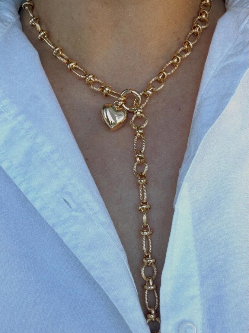 Trendowy łańcuch z zdejmowaną zawieszką posiada co najmniej trzy sposoby noszenia. Łańcuszek wykonany z mosiądzu pozłacanego, to znaczy, że jego jakość jest perfekcyjna i nie zgubie blasku długi czas.
